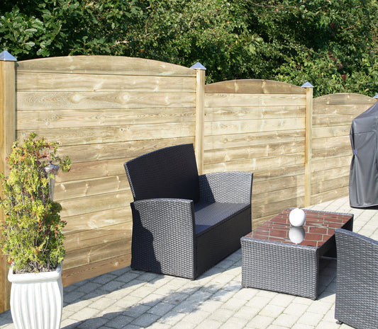 Profiiliaitaan 178,5 cm korkea, kolmen paneelin mittainen ponttilauta-aitasetti, kaareva yläosa HORTUS