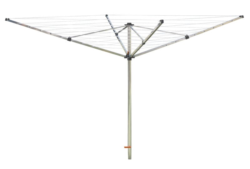 Pyörivä, sateenvarjomallinen pyykinkuivausteline JUWEL Prima 600 tarjoaa täydet 52 metriä kuivausnarua, joten se sopii hyvin esimerkiksi petivaatteiden, lakanoiden, pyyhkeiden ja pöytäliinojen kuivaukseen. Harmaat muoviosat ovat UV-suojattuja.