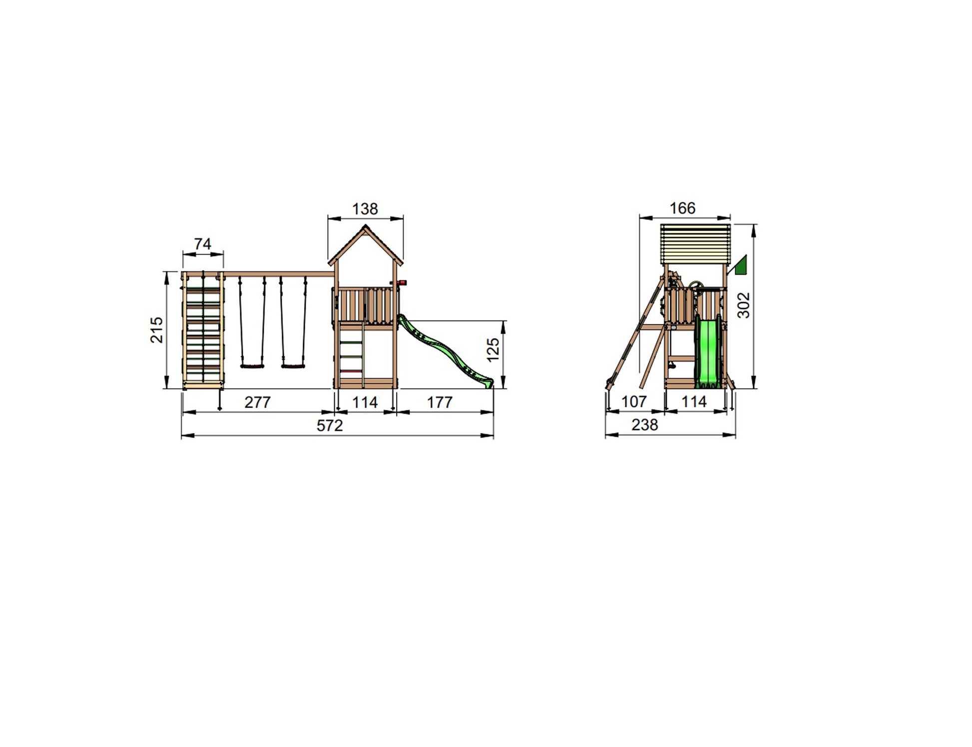 • Pinta-ala ilman turva-aluetta, leikkitorni: L: 303 x S:166 x K:302 cm