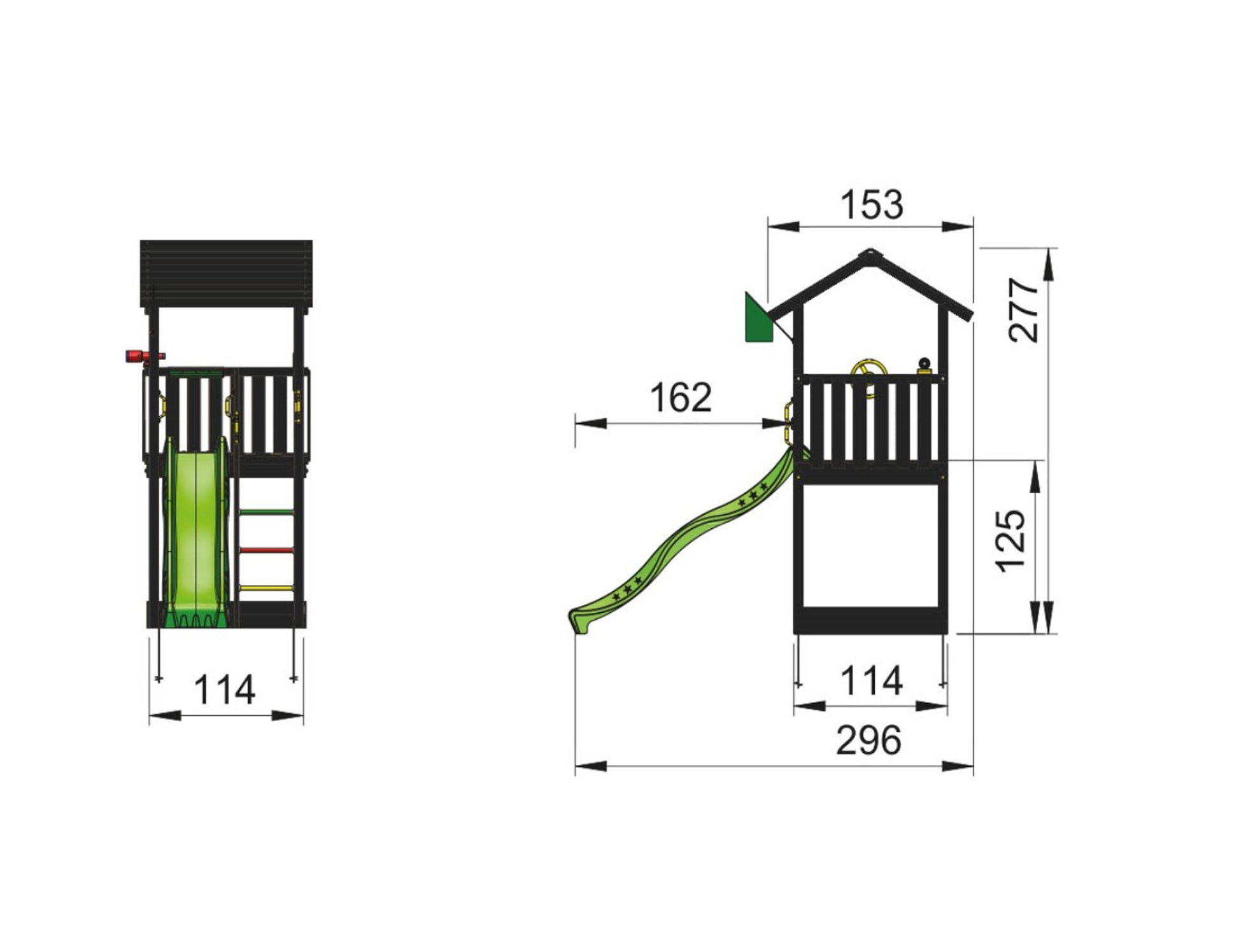 Tässä on klassinen ja kompakti leikkitorni perinteisellä kattomuotoilulla. Puinen harjakatto sovittaa tämän leikkitornin hienosti perinteiseen pihapiiriin. Perhe ja ystävät kutsutaan tietenkin kakkujuhliin alakerran hiekkalaatikkoon.