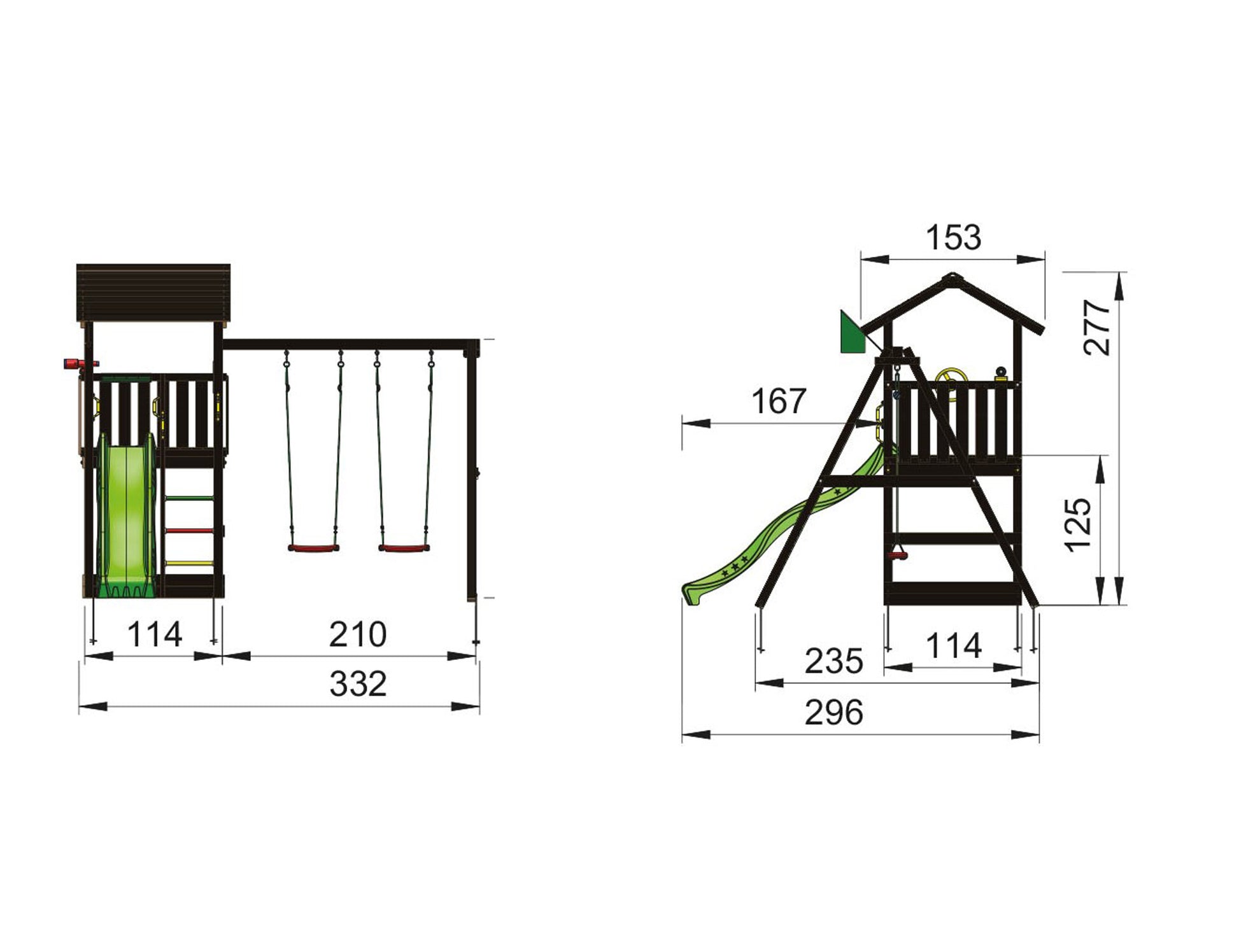 Tässä on klassinen ja kompakti leikkitorni perinteisellä kattomuotoilulla. Puinen harjakatto sovittaa tämän leikkitornin hienosti perinteiseen pihapiiriin. Pakettiin kuuluva keinumoduulin kaksi keinua tuovat leikkeihin lisää vauhtia. Perhe ja ystävät kutsutaan tietenkin kakkujuhliin alakerran hiekkalaatikkoon.