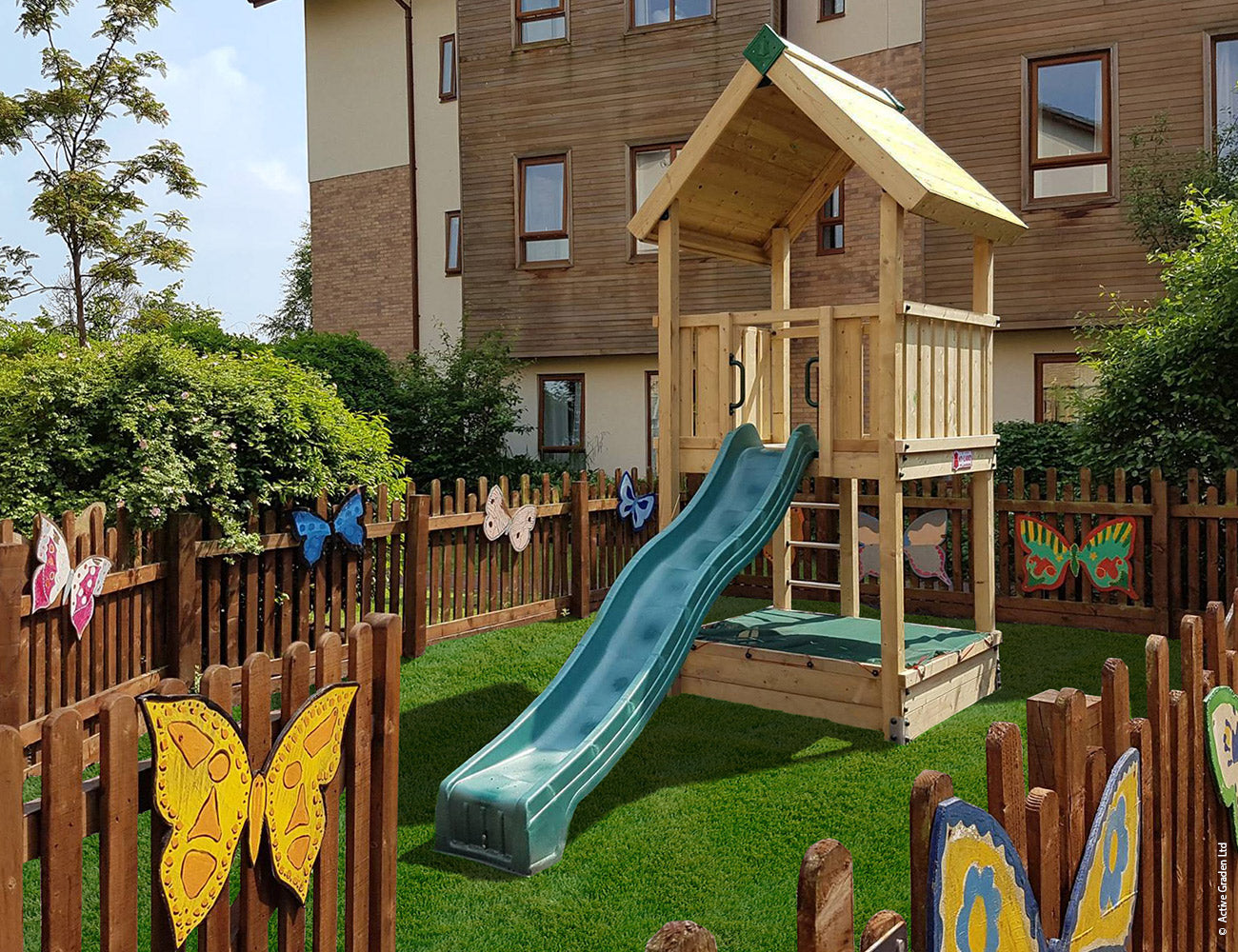 - Yksi leikkitorni, harjakatto (puuta)