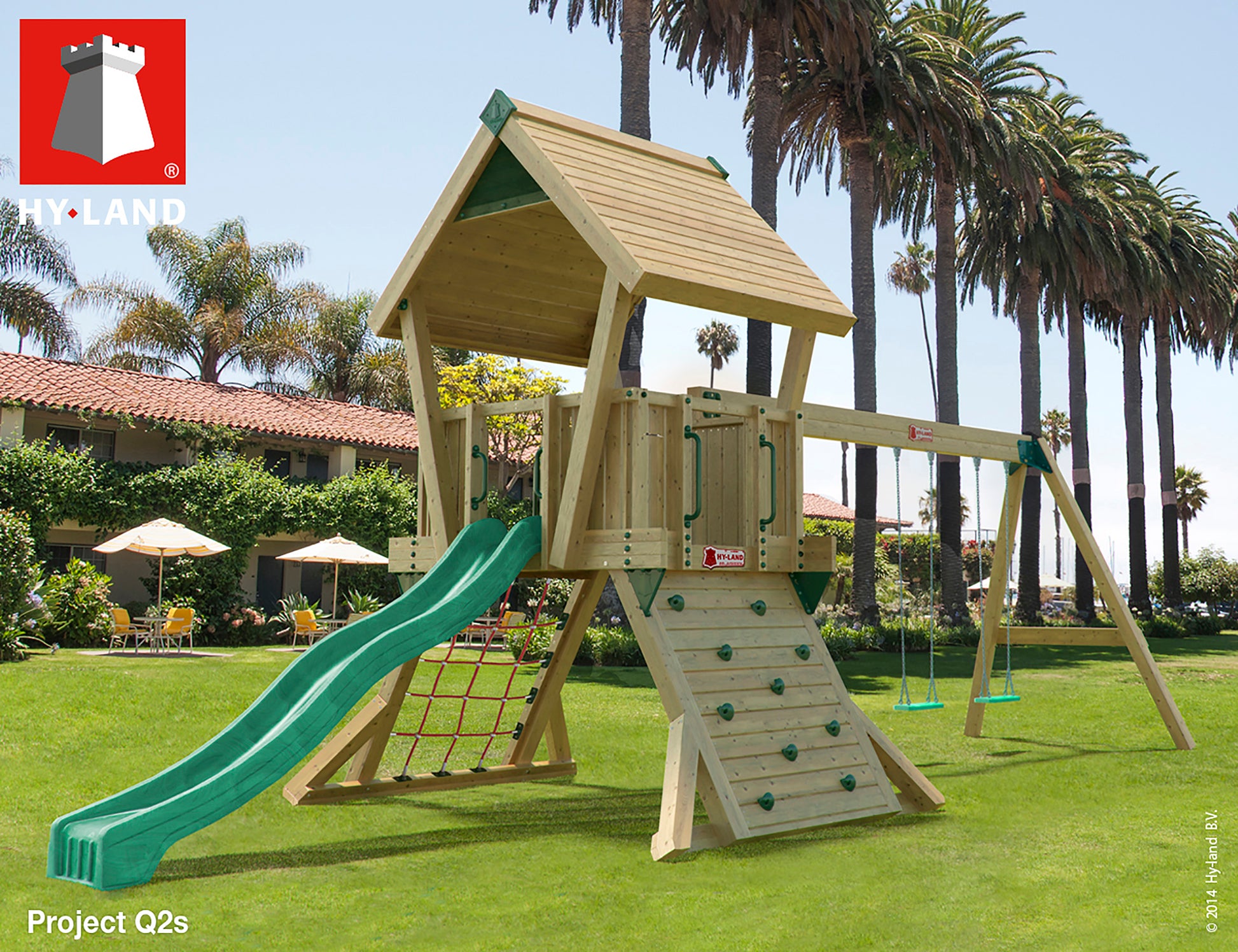 Hy-Land on vankka leikkiteline julkiseen käyttöön (standardi EN1176), mutta se sopii yhtälailla myös yksityiseen käyttöön. Q –mallisarjassa on perinteisestä poikkeava, lennokas muotoilu. Q –mallisarjassa nousu torniin tapahtuu aina kiipeilyverkon ja kiipeilyseinän kautta. Suunnittelussa on otettu huomioon turvallisuuden lisäksi myös monikäyttöisyys. Kaikissa leikkitorneissa on tietenkin liukumäki ja parhaimmillaan leikkitorni ajaa pitkälti myös leikkimökin virkaa. Lisäksi tässä Swing Module -mallissa on leikkitorniin kytketty myös keinuteline. Kun yhteen ja samaan kokonaisuuteen on koottu useita toimintoja, saadaan leikkimiseen varattu alue pihassa hyödynnettyä optimaalisesti ja edullisesti.