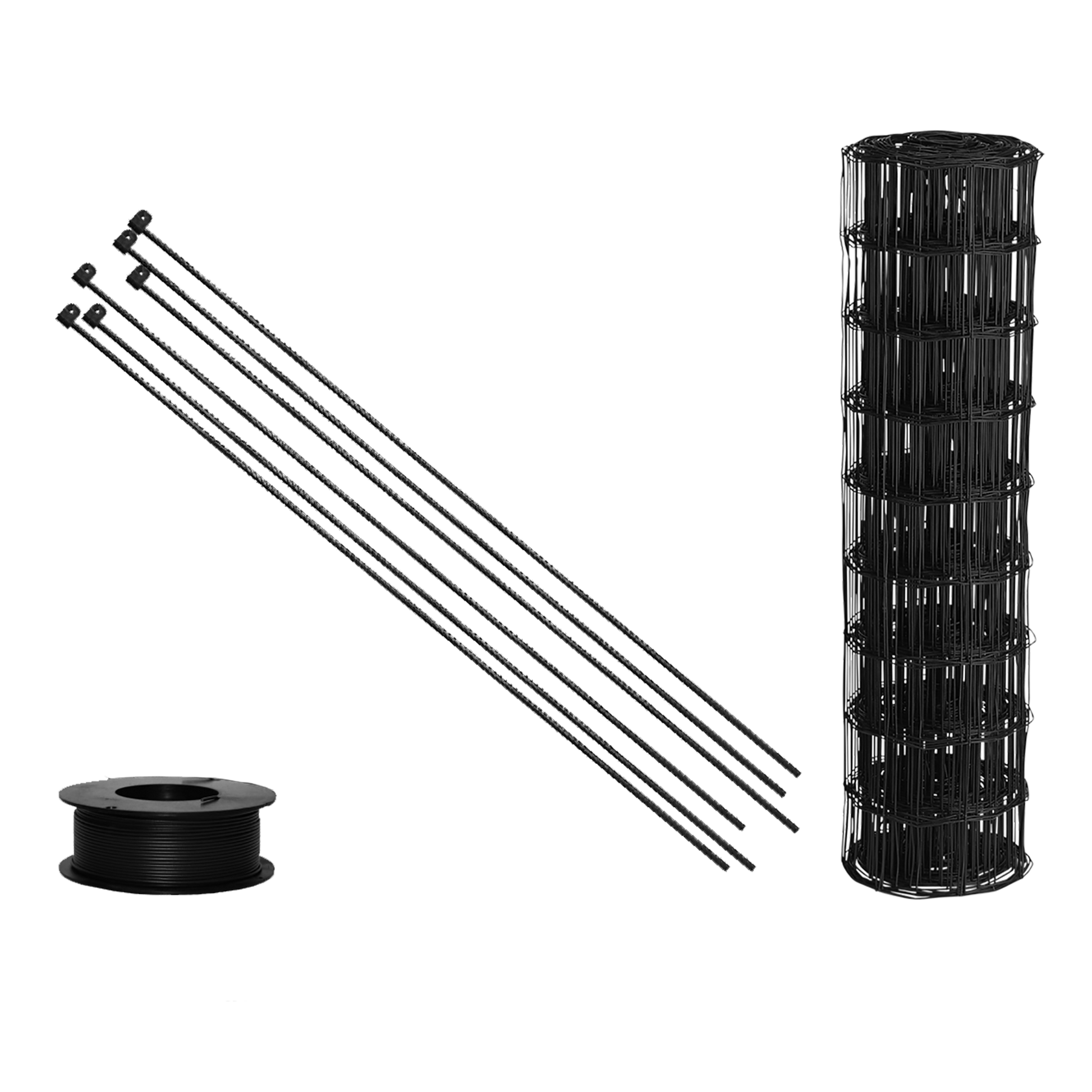 Paketissa on 75 metriä mustaa, korkeudeltaan 90 cm, muovipinnoitettua puutarha-aitaa (silmäkoko 10x10 cm), 30 kpl mustia harjaterästolppia (Ø8x1110 mm) sekä 60 metriä mustaa, galvanoitua sidontalankaa. Tolpat on tarkoitettu asennettavaksi noin 3 metrin välein. Tolpan voi pujottaa aidan silmien välistä ja/tai kiinnittää sidontalangalla.