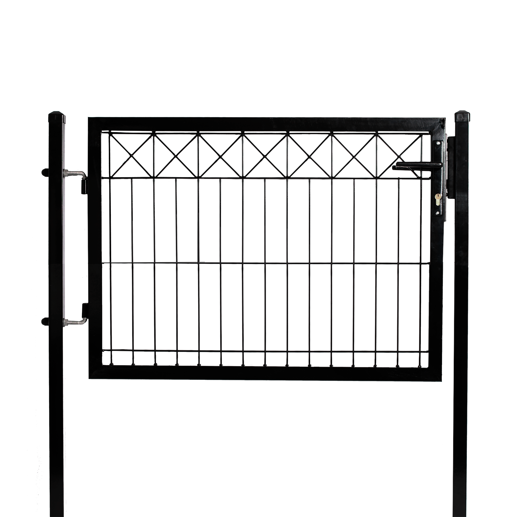 Elegantti musta paneeliaidan portti, jossa portin yläosassa on ”X” –koriste. Portin runko on tehty 40x40mm profiilista ja verkko-osa on tehty 5 mm metallilangasta. Osat on hitsauksen jälkeen pulverimaalattu. Porttin mukana toimitetaan 2 kpl 40 x 60 x 1500 mm tolppia, kahvat, lukot, avaimet ja 4 kpl kiinnikkeitä paneeliaidalle.