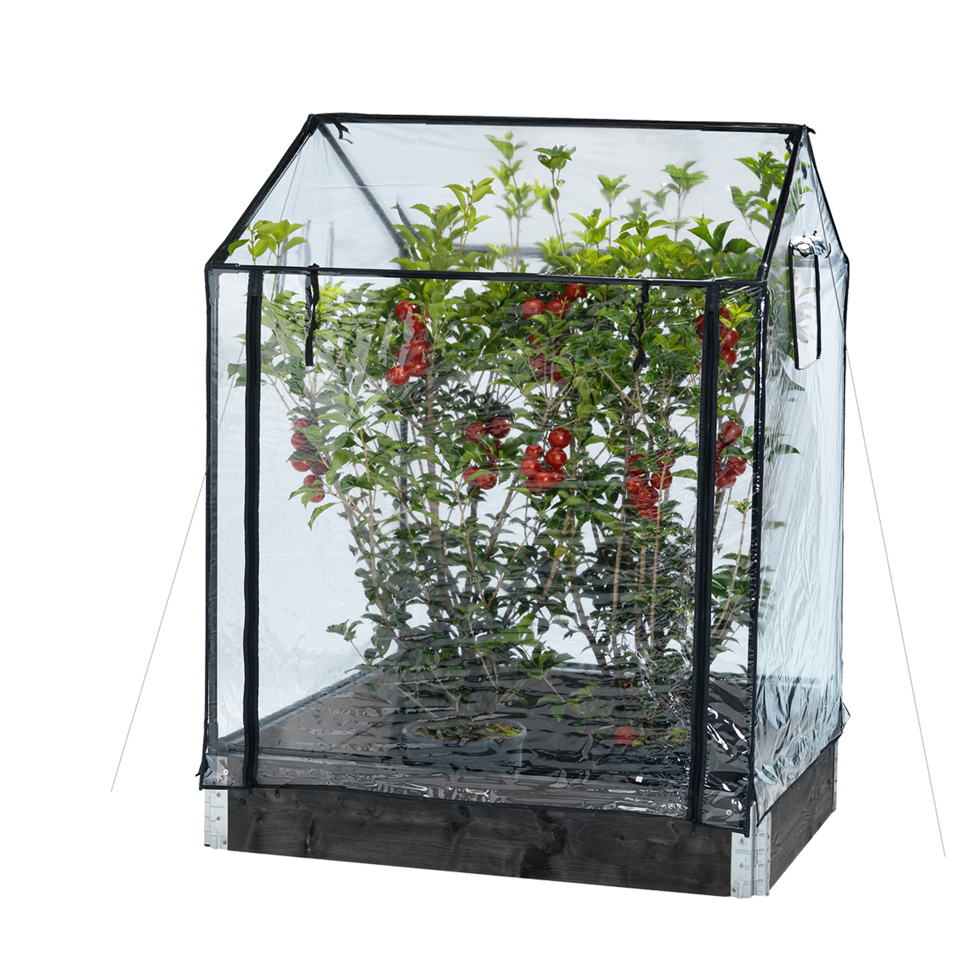 Kasvihuone kasvilavalle.Kasvilavan päälle tarkoitettu kasvihuone valmistettuna pvc -muovista, joka on ommeltu mustilla kanttauksilla.