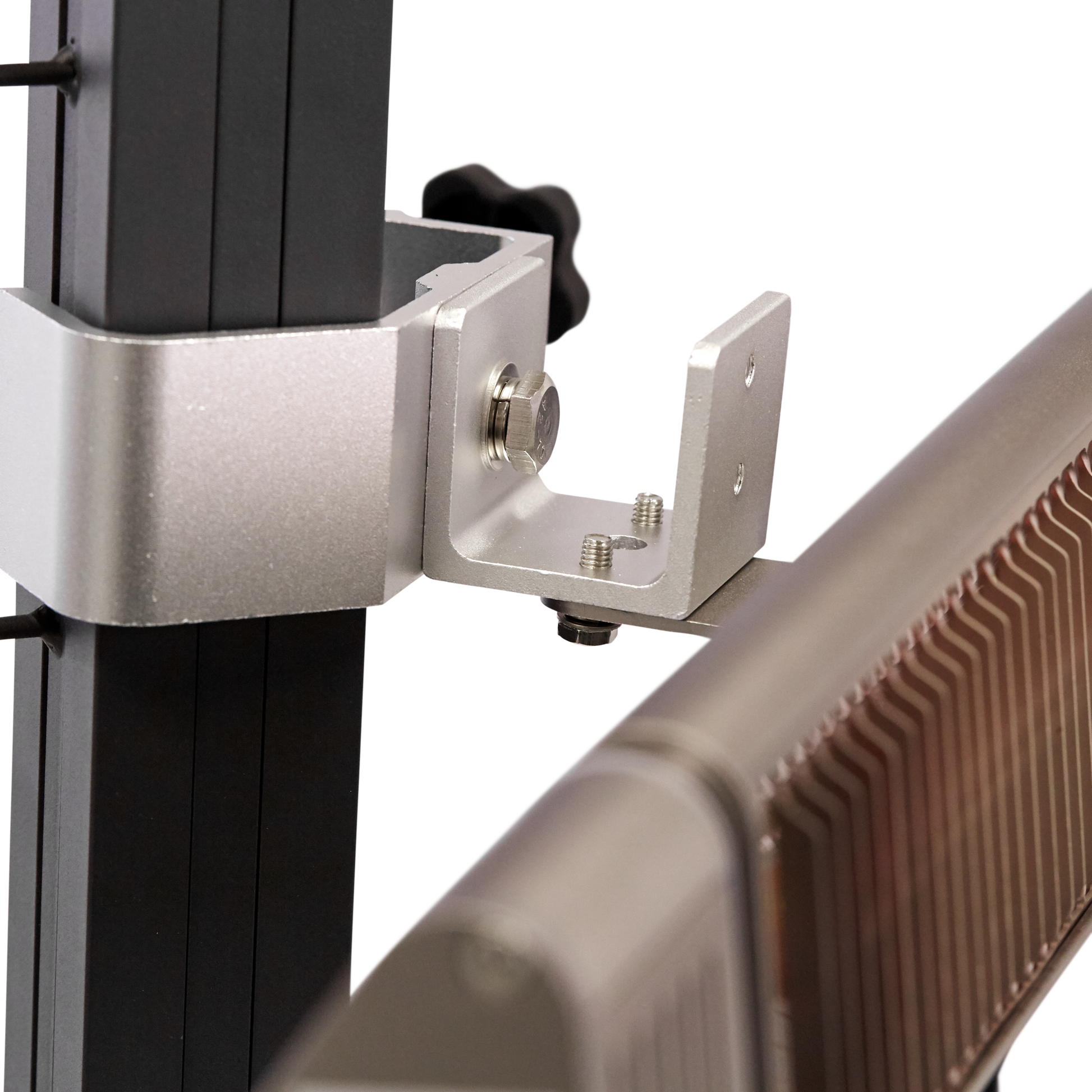 Yleismallinen, alumiinista valmistettu kiinnike sopii käytettäväksi kaikkien HEAT1 -terassilämmittimien kanssa. Tällä kiinnikkeellä lämmitin voidaan kiinnittää kulmikkaisiin tai pyöreisiin rakenteisiin, kuten terassien tai katosten runkoihin tai aurinkovarjojen jalkoihin. Kun kiinnike on paikoillaan, käy lämmittimen kiinnittäminen siihen helposti yhdellä ruuvilla. Kiinnikkeessä on kuminen tartuntapinta suojaamassa pintoja naarmuilta. Kiinnikkeen aukeama on säädettävissä välillä 30-58 mm.