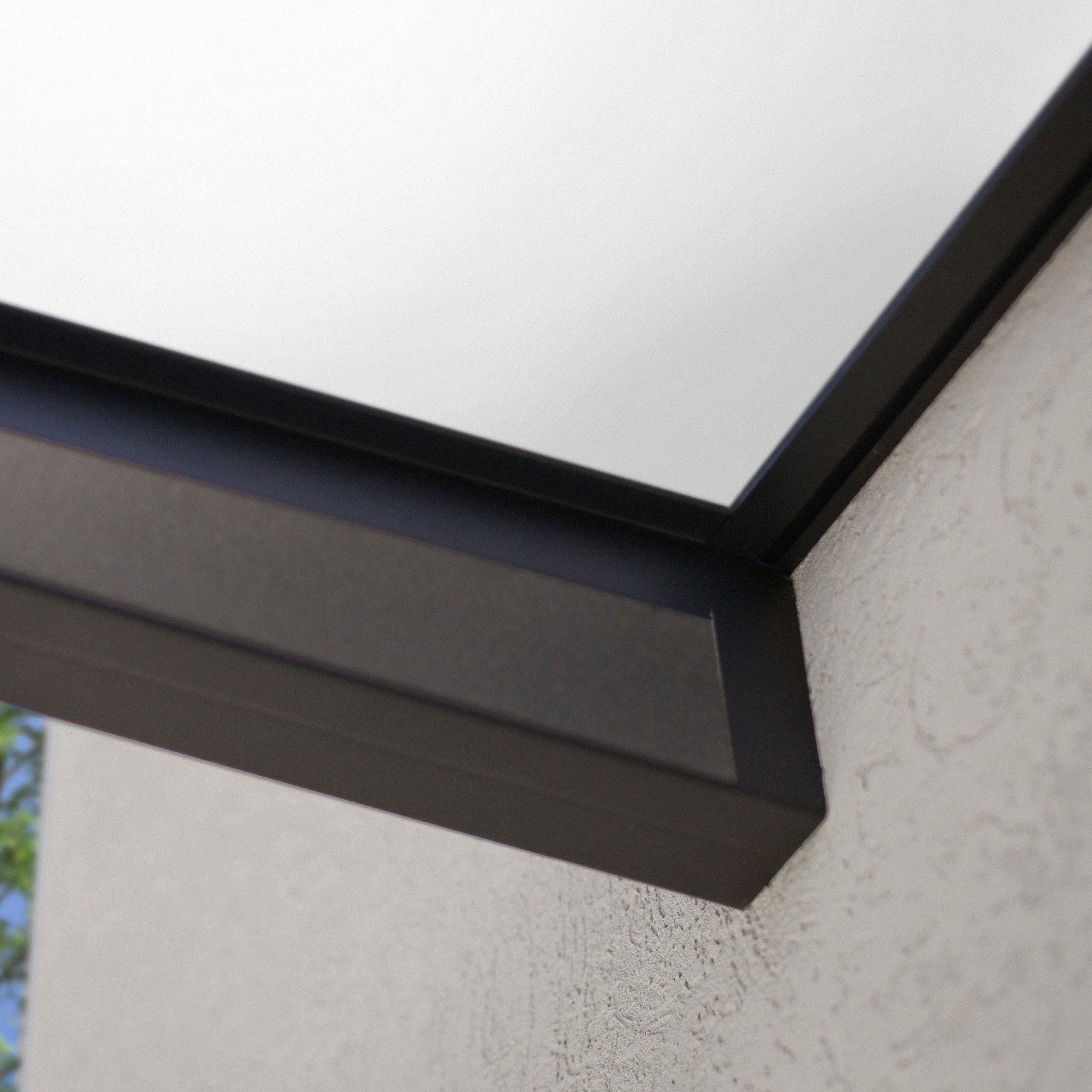 Tämä ovikatos on suunniteltu kestämään ankarat pohjoiset sääolot. Katoksen iskunkestävä, valkoinen 4 mm polykarbonaattipaneeli tarjoaa omaisuudellesi suojaa UV -säteilyn haitallisia vaikutuksia vastaan. Vankka, pulverimaalattu alumiiniprofiilirunko ja galvanoidut teräskannakkeet on viimeistelty tummanharmaaksi. Patentoitu, ruuviton paneelin asennus on erityisesti suunniteltu estämään kosteuden ja sadeveden haitalliset vuodot. Integroitu vesikouru ohjaa sadevedet katoksen sivulle.
