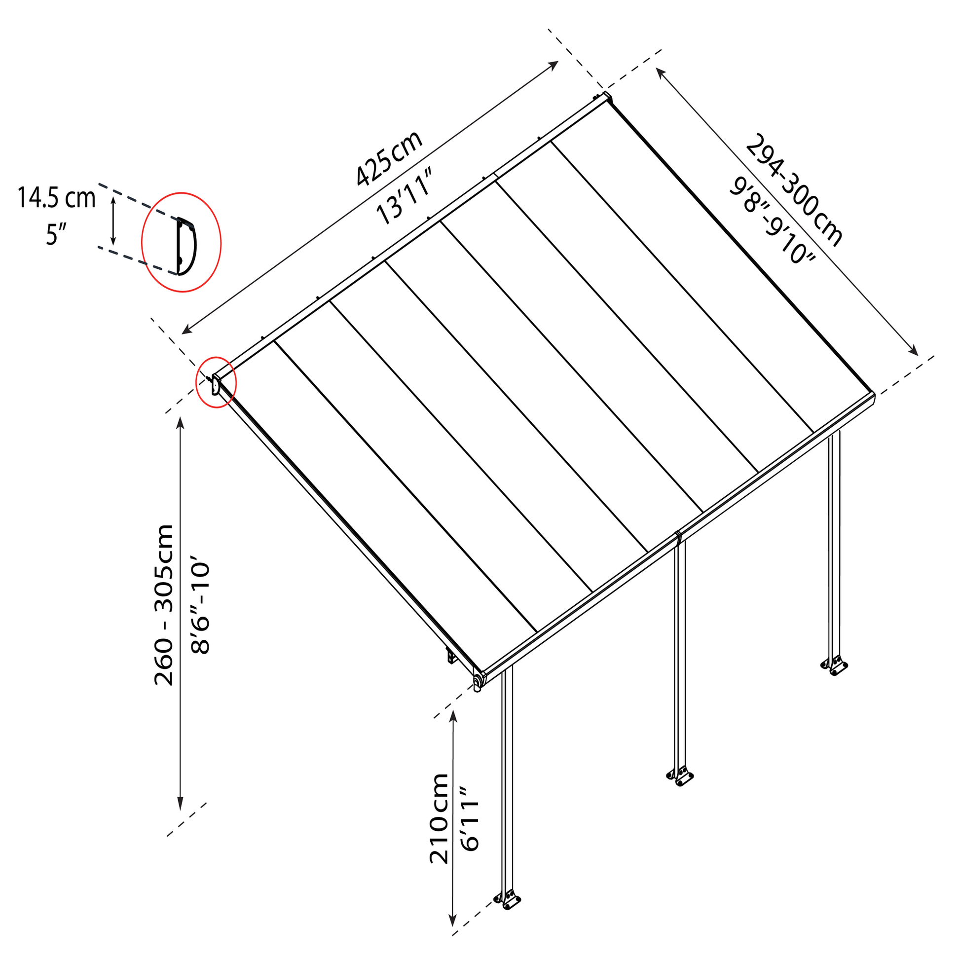 • Terassikatoksen mitat: leveys: 425 x syvyys: 295 x korkeus: 260-305 cm