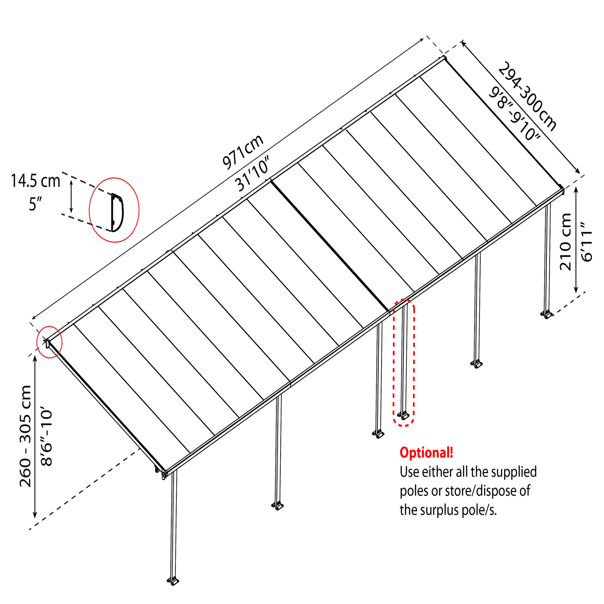 • Terassikatoksen mitat: leveys: 971 x syvyys: 295 x korkeus: 260-305 cm