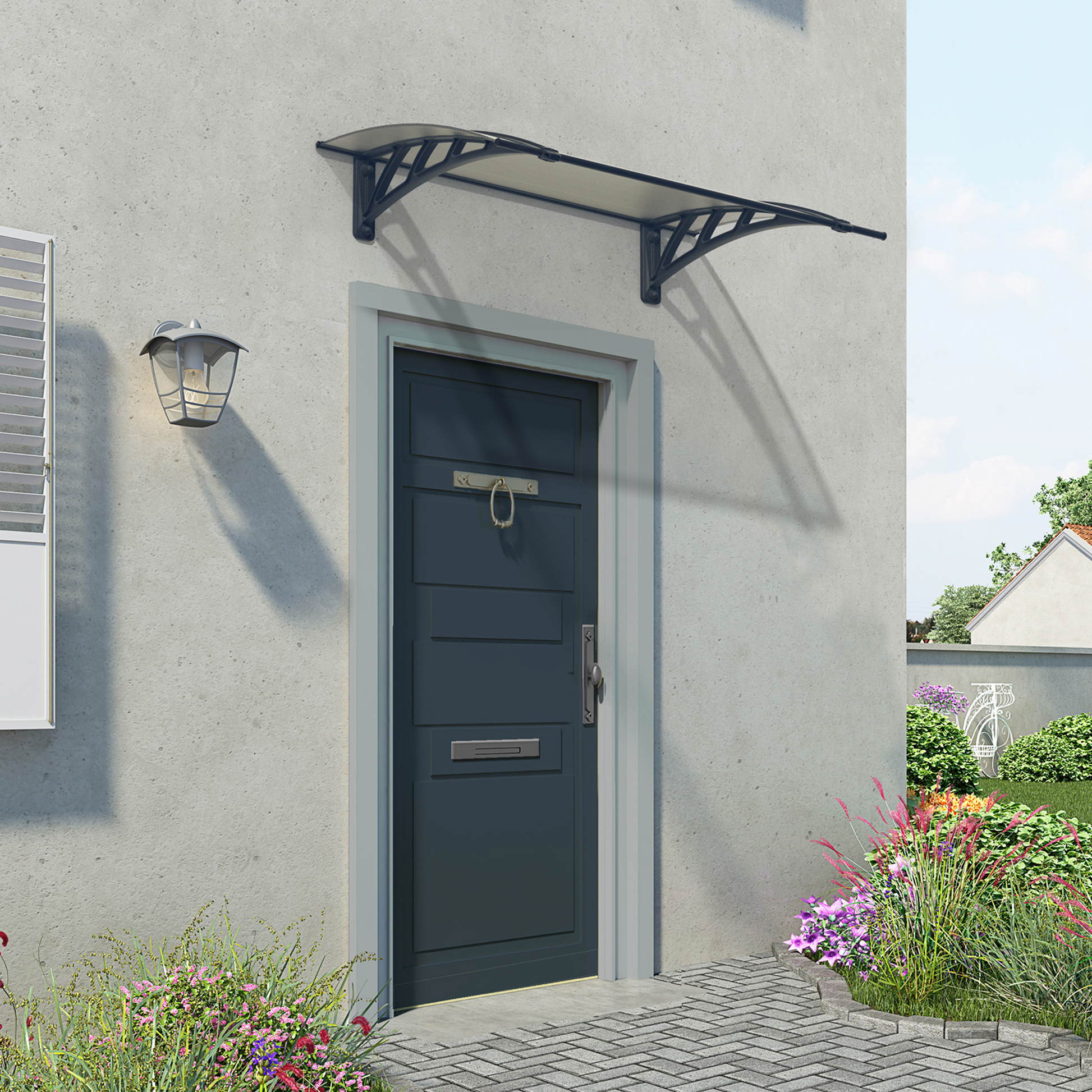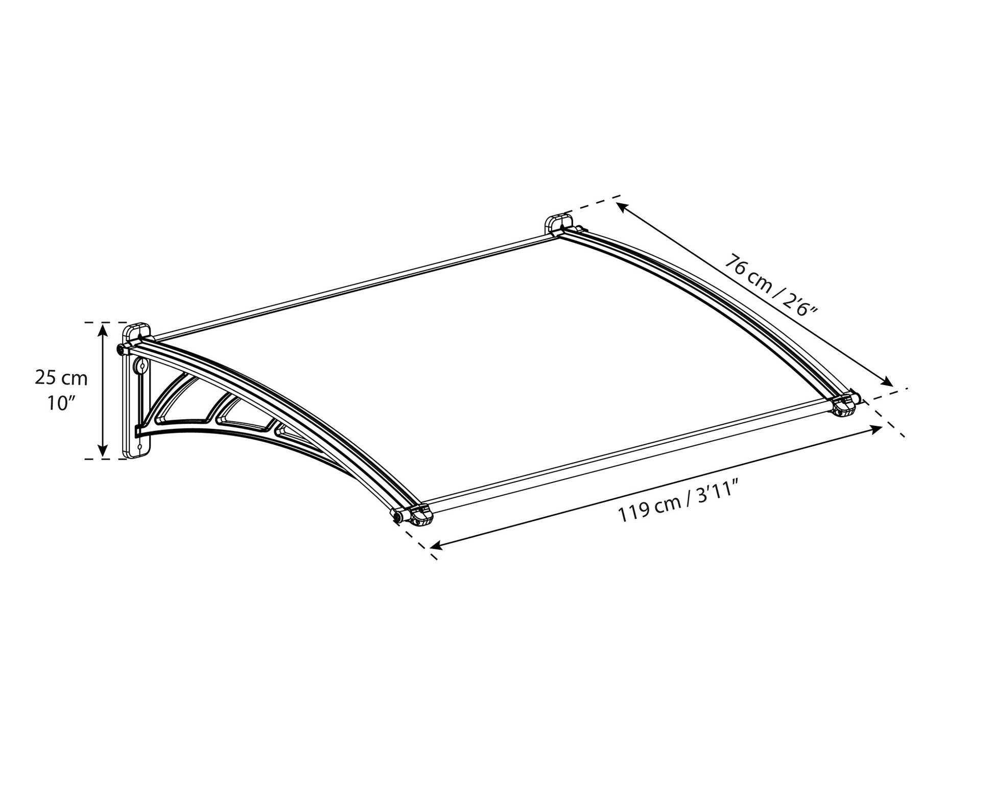 Tämä nykyaikainen, kaareva katos suojaa kätevästi oviaukkoa tai ikkunaa ankarilta sääolosuhteilta. Katoksen materiaalit ovat ympäristöystävällisiä. Katos lisää koko rakennuksen tyyliä ja arvoa.