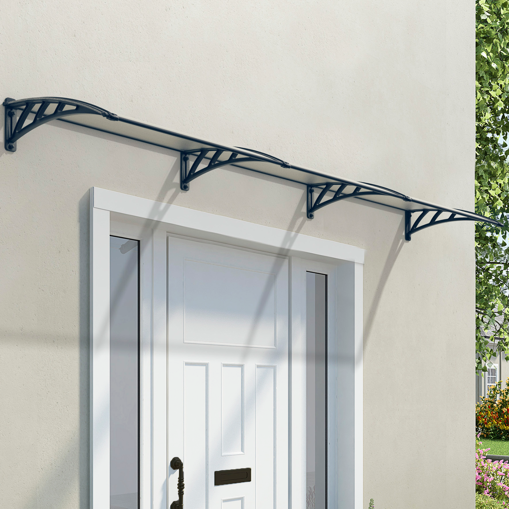 Tämä nykyaikainen, kaareva katos suojaa kätevästi oviaukkoa tai ikkunaa ankarilta sääolosuhteilta. Katoksen materiaalit ovat ympäristöystävällisiä. Katos lisää koko rakennuksen tyyliä ja arvoa.