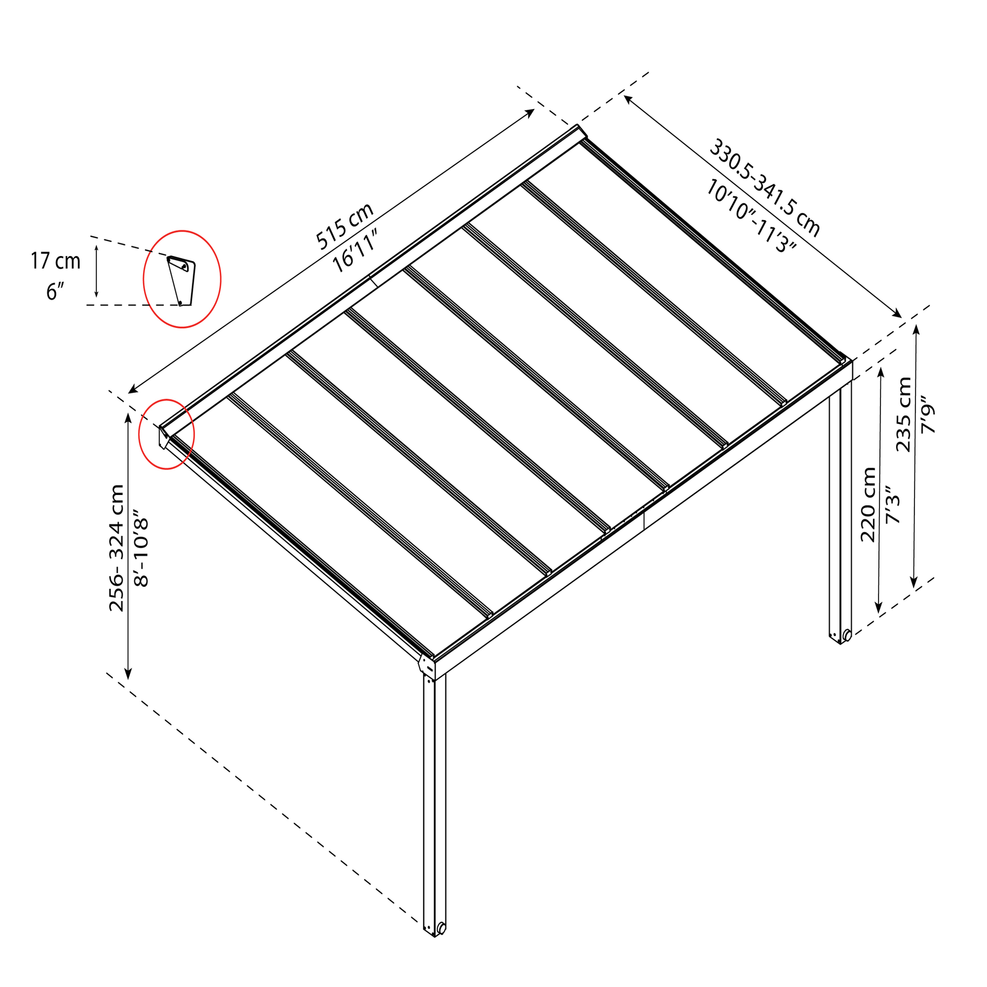 Terassikatokset mitat: leveys 515 x syvyys 330,5-341 x korkeus 256,5-324 cm