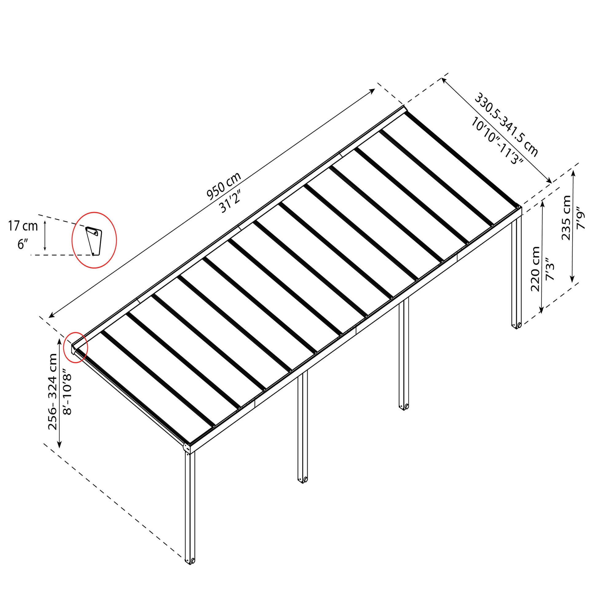 Terassikatokset mitat: leveys 950 x syvyys 330,5-341 x korkeus 256,5-324 cm