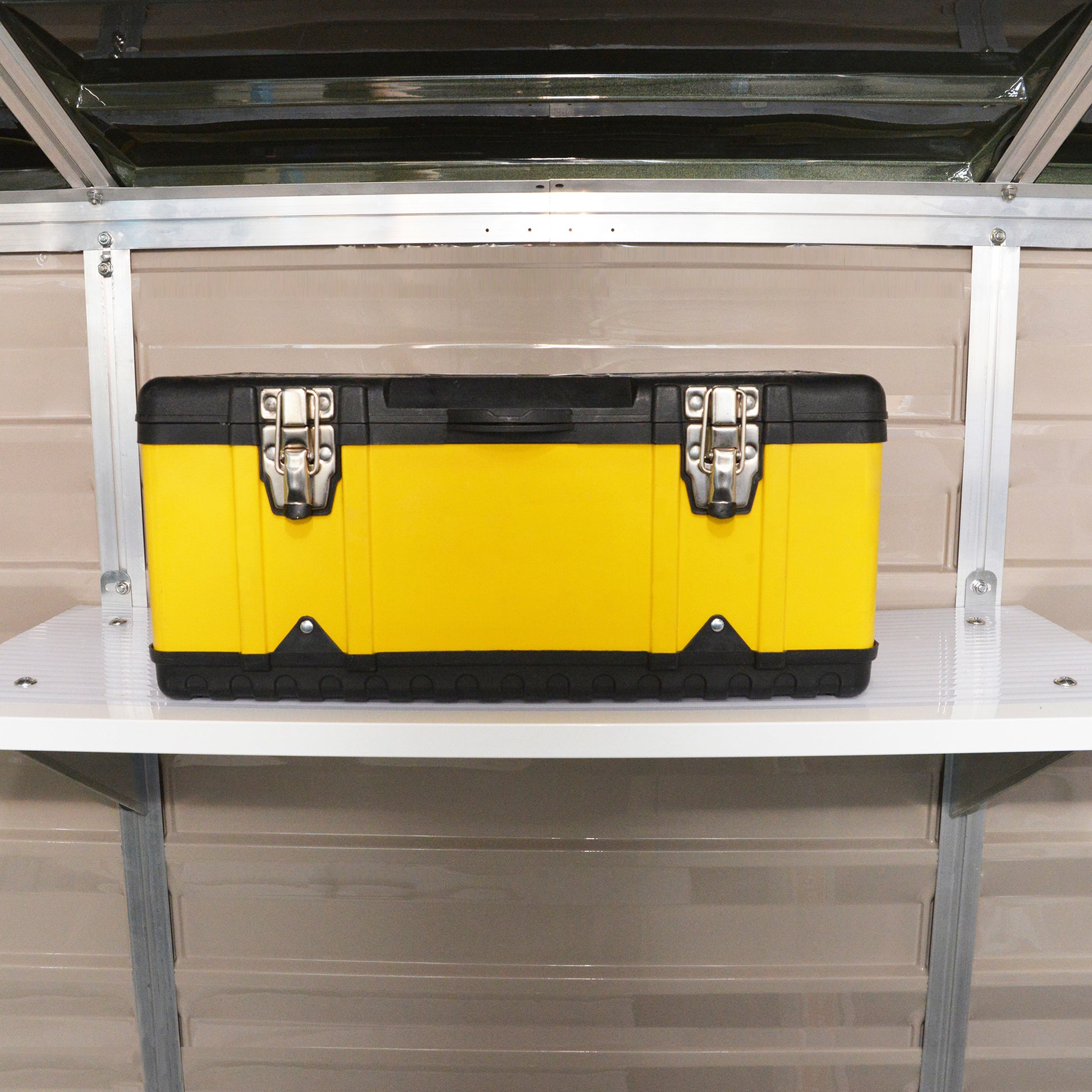 Optimoi säilytystilasi SKYLIGHT-säilytyshyllyllä. Tämä on täydellinen sarja, joka koostuu polykarbonaatista, 16 mm, korkealaatuisesta hyllystä ja kahdesta galvanoidusta teräsosasta. Hylly antaa sinulle mahdollisuuden organisoida tavarat vajassa. Hyllyn kantavuus 30 kg. Hylly on tarkoitettu asennettavaksi SKYLIGHT- ja VOYAGER-sarjan alumiinirunkoisiin vajoihin.