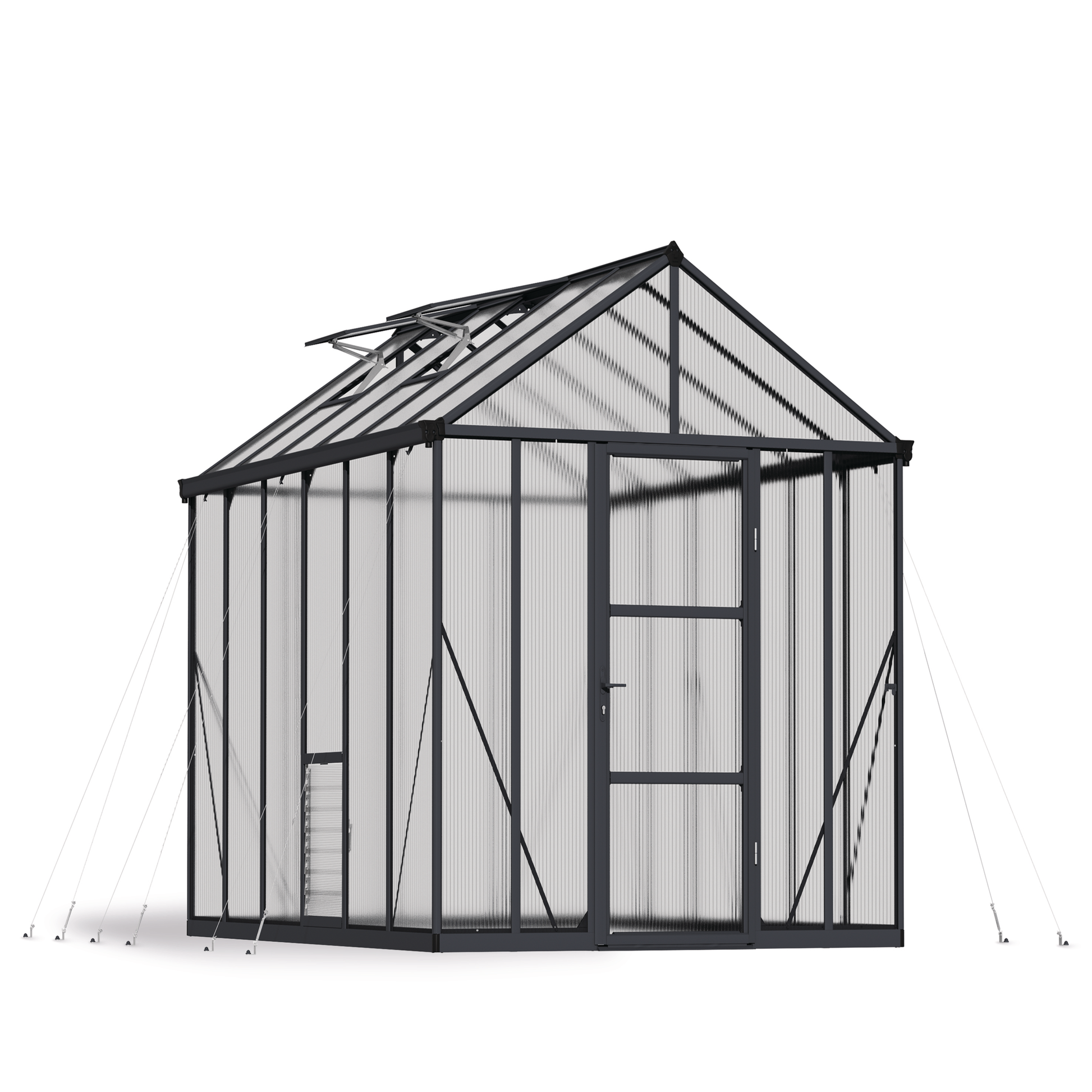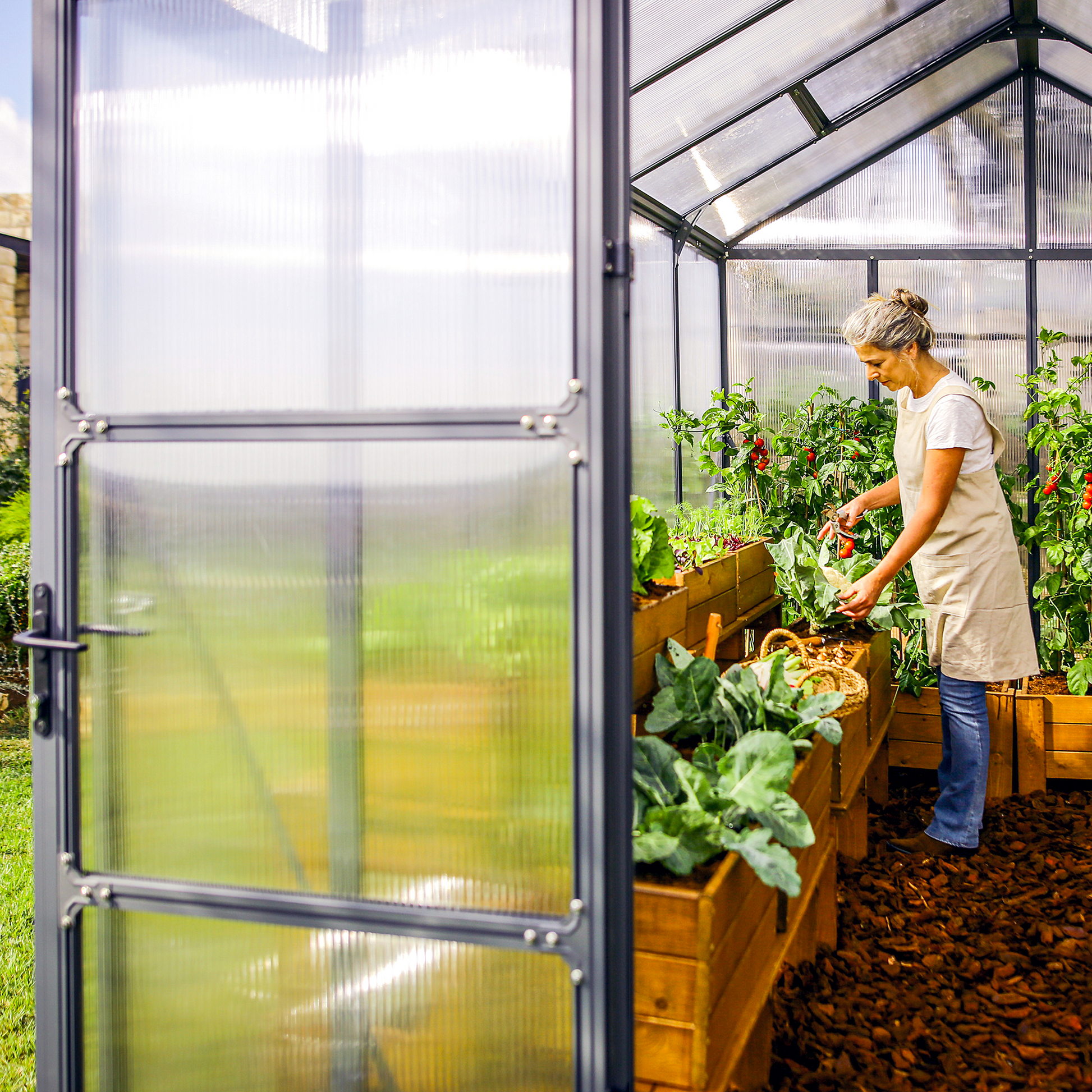 Leveä ovi ja mukana tulevat lisävarusteet varmistavat optimaalisen ilmanvaihdon ja auttavat ylläpitämään tarvittavat kosteus- ja lämpötilaolosuhteet. Korkea katto tarjoaa runsaasti tilaa seistä pystyssä ja enemmän tilaa kasvattaa korkeitakin kasveja. Kasvihuoneen galvanoidusta teräksestä valmistettu sokkeli on pitkäikäinen ja lisää koko kasvihuoneen vakautta. Kasvihuone on esteettisesti silmää miellyttävä ja elegantti harmaaksi pulverimaalatun vankan alumiinirunkonsa ansiosta. Käytännössä katsoen rikkoutumattomat 10 mm kaksiseinäiset polykarbonaattipaneelit eristävät hyvin lämpöä ja kestävät iskuja sekä raekuuroja ja ovat 100 % UV-suojattuja antaen myös tältä osin lisäsuojaa. Tukeva alumiinirunko on vahva, huoltovapaa ja korroosionkestävä. Leveä ulko-ovi ja matala kynnys helpottavat sisäänpääsyä sekä kottikärryillä että pyörätuolilla. Sokkeliin integroitu ankkurointijärjestelmä yhdessä kasvihuoneen ulkopuolisen ankkurointisarjan kanssa antaa kasvihuoneelle lisätukea myrskysäällä. Varusteluun kuuluvat kattoluukut automaattisilla avaajilla, suljettava ilmanvaihtosäleikkö sivuseinässä, kasviripustin- ja ankkurointisarjat. Kasvihuone on helppo koota liukupaneelijärjestelmän ansiosta. Suuret sadevesikourut mahdollistavat sadeveden keräämisen.