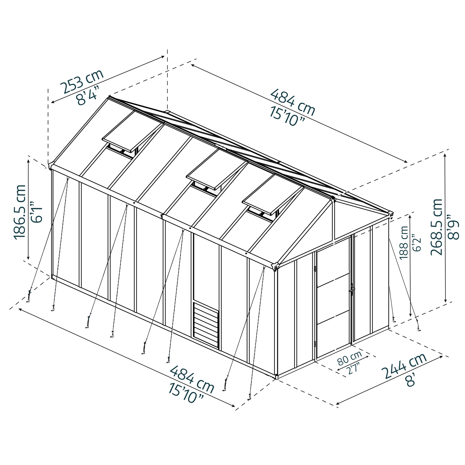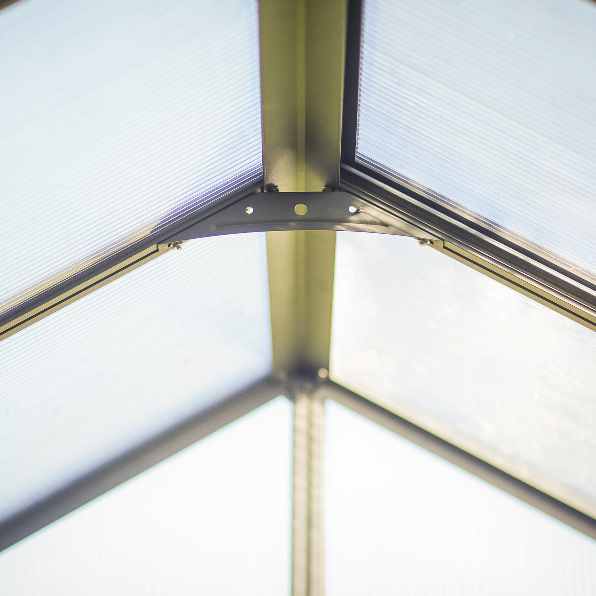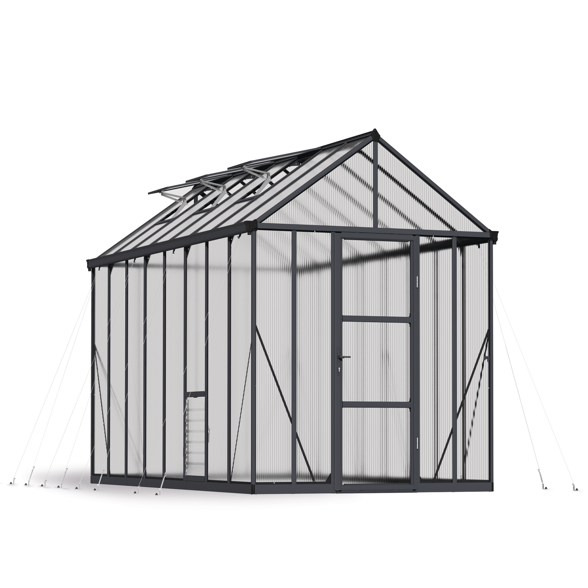 Leveä ovi ja mukana tulevat lisävarusteet varmistavat optimaalisen ilmanvaihdon ja auttavat ylläpitämään tarvittavat kosteus- ja lämpötilaolosuhteet. Korkea katto tarjoaa runsaasti tilaa seistä pystyssä ja enemmän tilaa kasvattaa korkeitakin kasveja. Kasvihuoneen galvanoidusta teräksestä valmistettu sokkeli on pitkäikäinen ja lisää koko kasvihuoneen vakautta. Kasvihuone on esteettisesti silmää miellyttävä ja elegantti harmaaksi pulverimaalatun vankan alumiinirunkonsa ansiosta. Käytännössä katsoen rikkoutumattomat 10 mm kaksiseinäiset polykarbonaattipaneelit eristävät hyvin lämpöä ja kestävät iskuja sekä raekuuroja ja ovat 100 % UV-suojattuja antaen myös tältä osin lisäsuojaa. Tukeva alumiinirunko on vahva, huoltovapaa ja korroosionkestävä. Leveä ulko-ovi ja matala kynnys helpottavat sisäänpääsyä sekä kottikärryillä että pyörätuolilla. Sokkeliin integroitu ankkurointijärjestelmä yhdessä kasvihuoneen ulkopuolisen ankkurointisarjan kanssa antaa kasvihuoneelle lisätukea myrskysäällä. Varusteluun kuuluvat kattoluukut automaattisilla avaajilla, suljettava ilmanvaihtosäleikkö sivuseinässä, kasviripustin- ja ankkurointisarjat. Kasvihuone on helppo koota liukupaneelijärjestelmän ansiosta. Suuret sadevesikourut mahdollistavat sadeveden keräämisen.