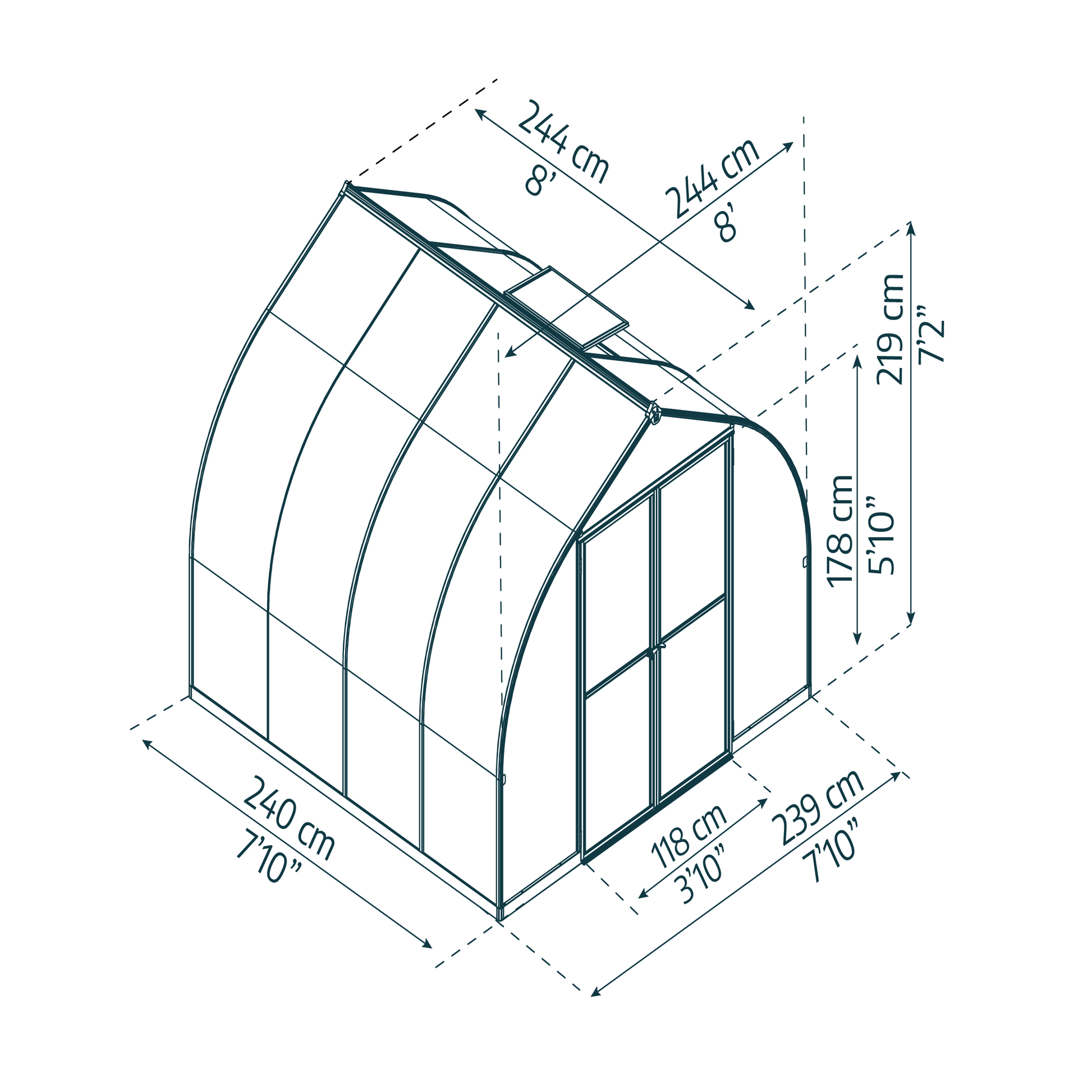 Kasvihuoneen 2,4 metrin leveys lisää tilan käytännöllisyyttä. Bella -kasvihuone on varustettu käytännöllisesti katsoen rikkoutumattomilla kaksiseinäisillä polykarbonaattipaneeleilla, jotka luovat täydellisen yhdistelmän auringonvalon läpäisyä, lämmöneristystä ja suojausta kasviesi tarpeisiin. Kellon mallinen muotoilu on kehitetty erityisesti parantamaan myrskynkestävyyttä ja mahdollistamaan lumen liukumisen katolta helposti. Avaran pohjaratkaisun ja leveiden pariovien ansiosta jopa innokkaimmalla puutarhurilla on runsaasti tilaa kasvattaa vihanneksia ja yrttejä sekä säilyttää työkaluja ja tarvikkeita.