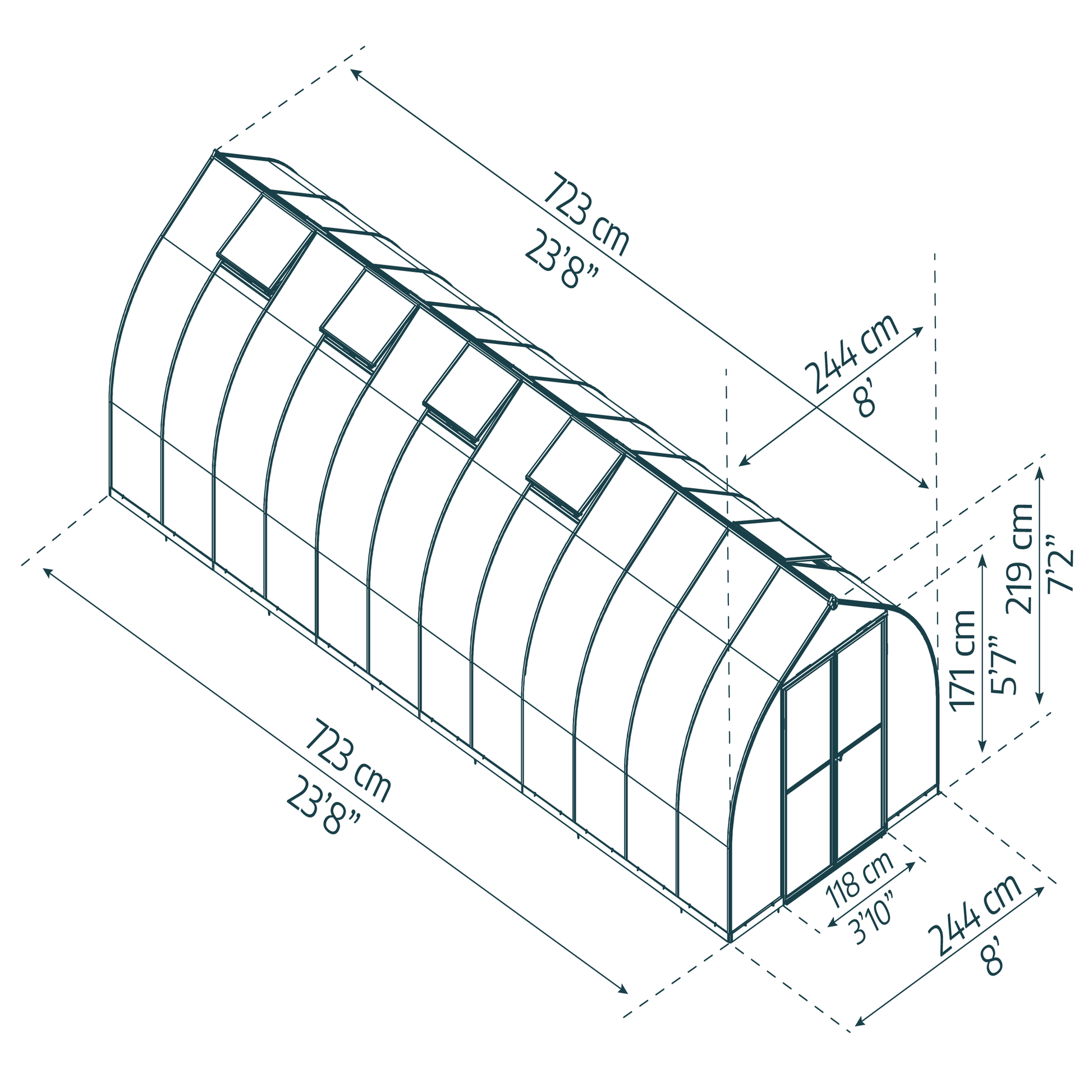 Säänkestävyys ympäri vuoden: kellomainen muotoilu auttaa lumia liukumaan pois kasvihuoneen katolta ja samalla muotoilu parantaa kasvihuoneen tuulenkestävyyttä (testattu 33,3 m/s tuulikuormalle ja 100 kg/m2 lumikuormalle).