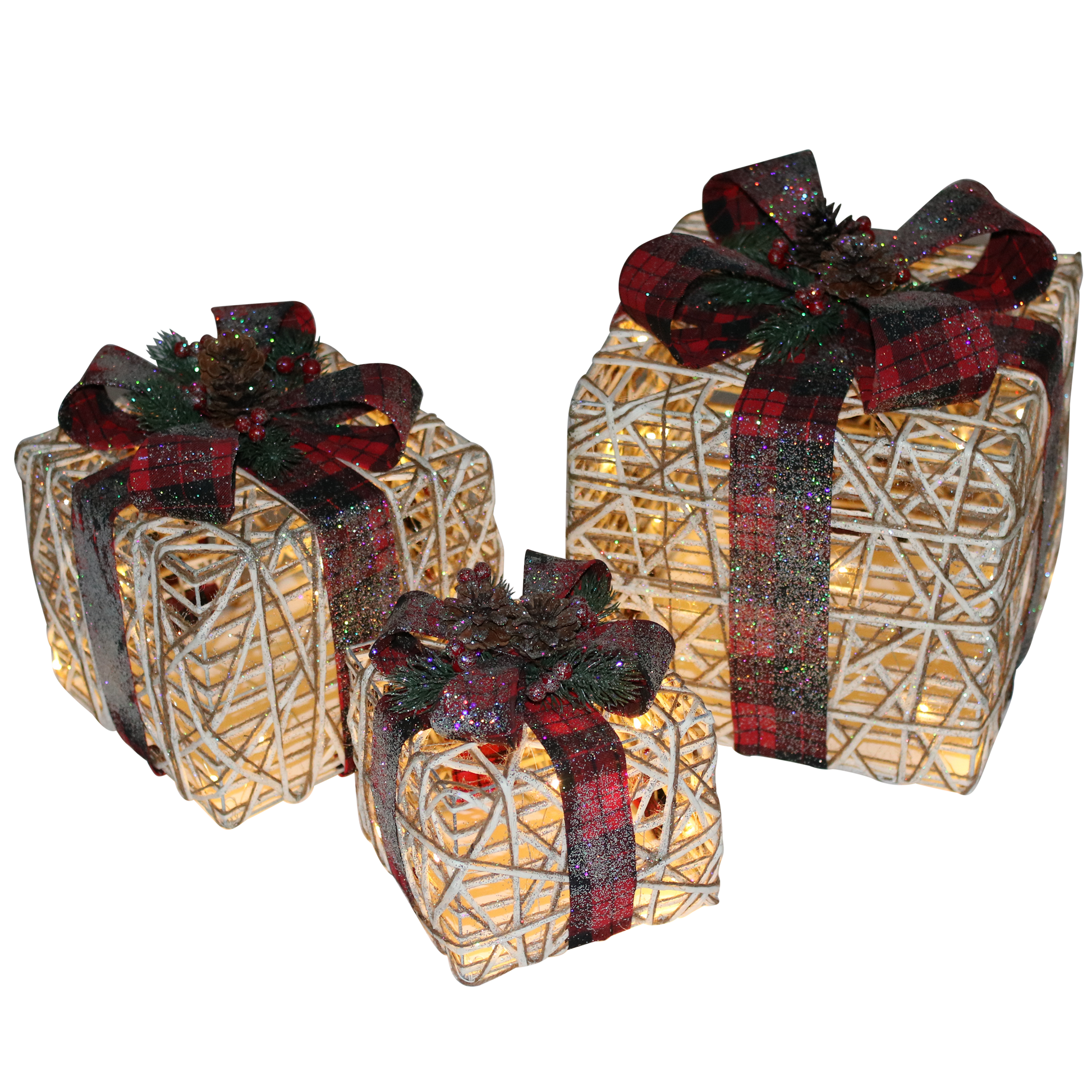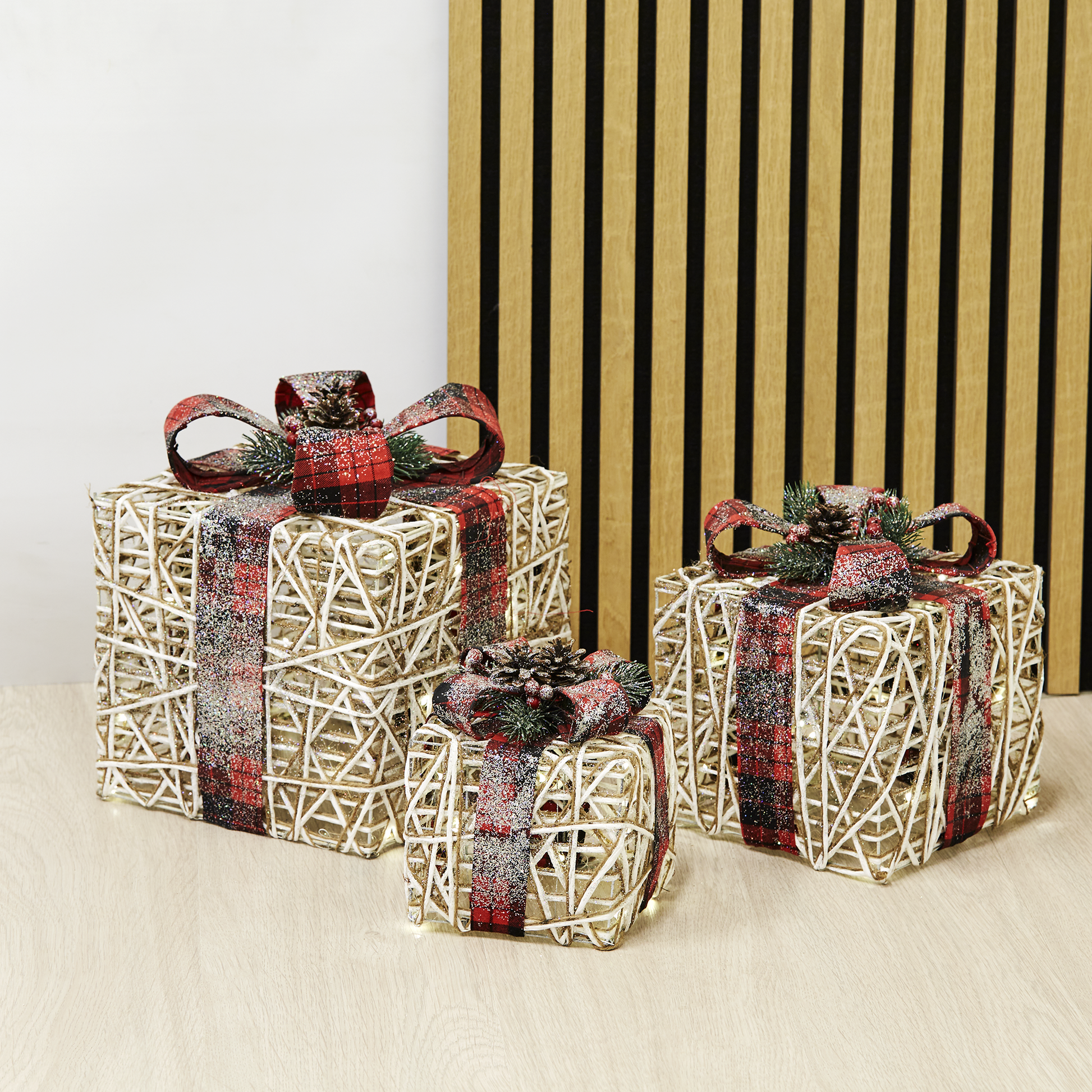 Luo oikea joulutunnelma näillä kolmella kauniilla ja koristeellisella joulupaketilla, joissa on lämmin valkoinen valo, 230 V. Paketit ovat koristeltu kuusenoksilla, kävyillä ja viimeistelty suurella, tyylikkäällä punaisella rusetilla. Sarja koostuu 3 paketista kooltaan 15 x 15, 20 x 20 ja 25 x 25 cm.
