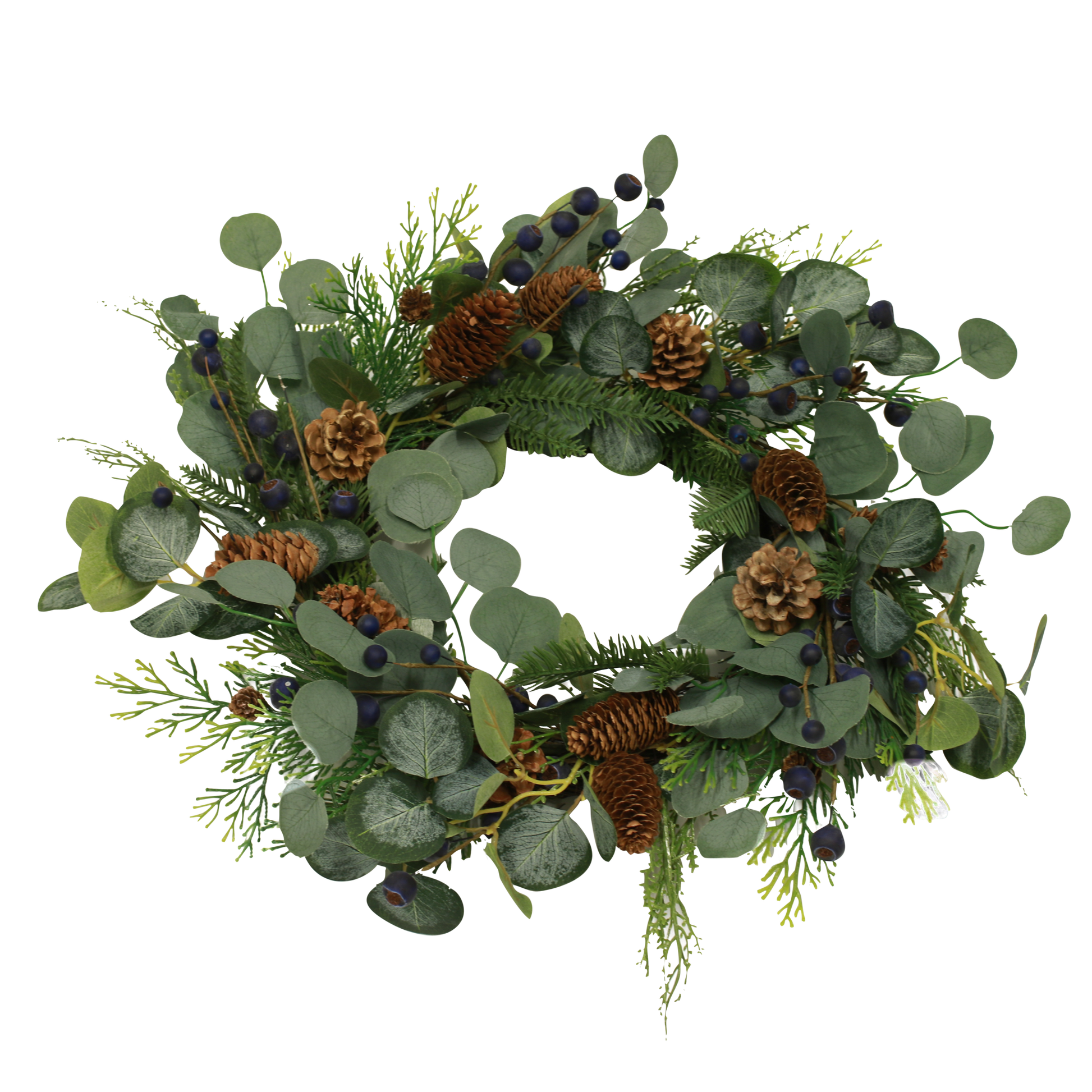 Kaunis ja tyylikäs kranssi mustikoilla, eukalyptuksen oksilla, kävyillä jne. Sopii koristeluun niin syksyllä kuin jouluna. Mitat Ø50 cm.