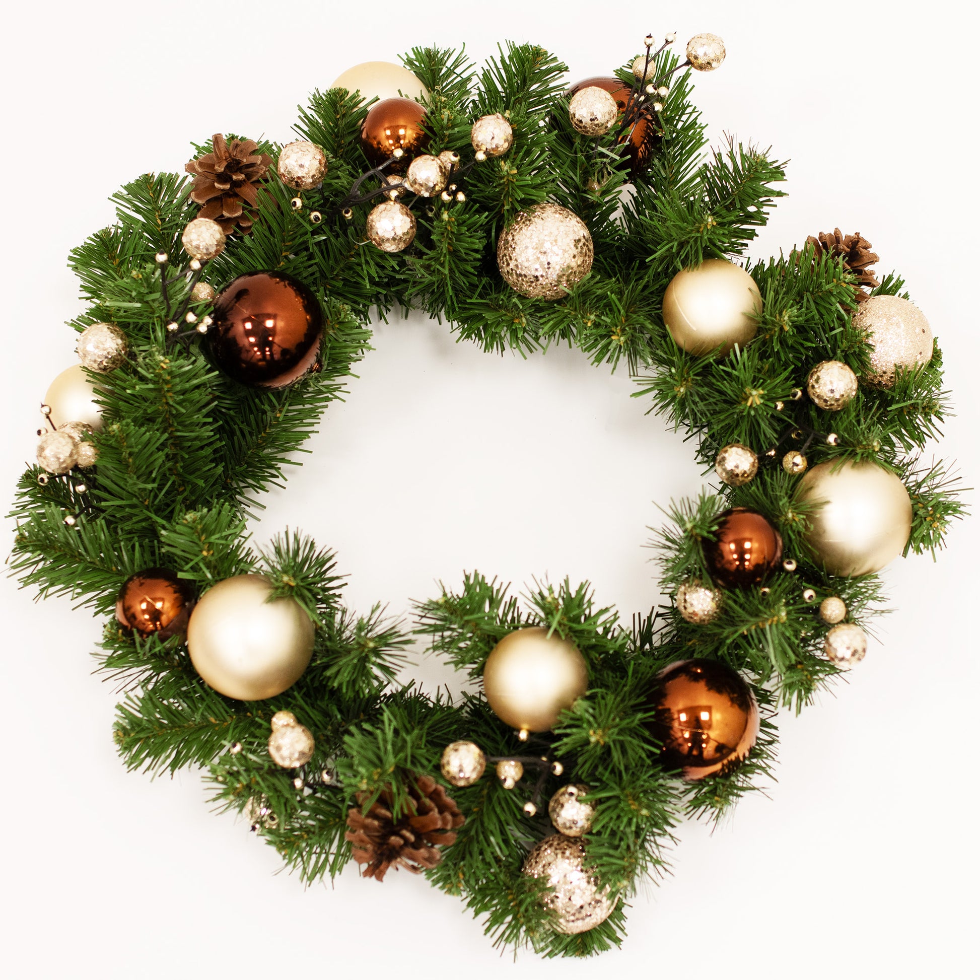 Havukranssi, jossa on paljon mukavia joulukoristeita, jotka saavat sinut joulutunnelmaan. Joulupalloja eri kokoisina, käpyjä ja marjoja - kaikki yhteensopivissa väreissä. Täydellinen joulupöytään, ovelle tai ikkunaan ripustettavaksi, toimiston sisustamiseen jne.