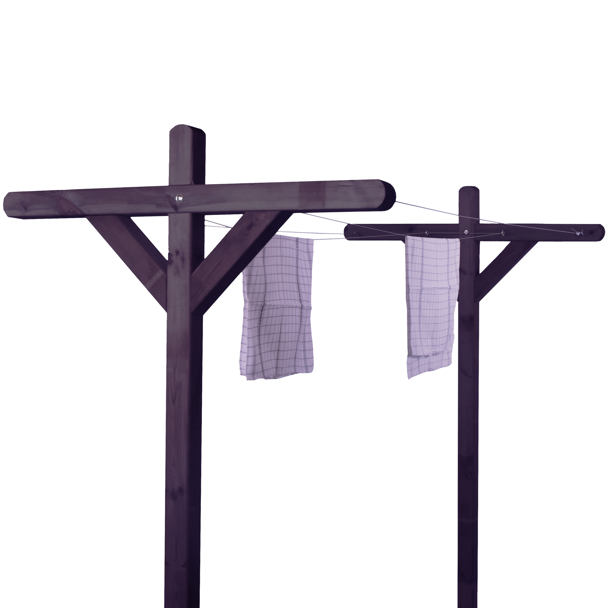 HORTUS pyykkiteline ja 20 metriä pyykkinarua. Valmistettu mustaksi petsatusta 70 x 70 mm männystä. Mukana 20 metriä pyykkinarua. Tolpat ovat pituudeltaan 270 cm. Tolpat on tarkoitus upottaa ja valaa maahan. Mukana yksityiskohtaiset asennusohjeet 2 tolppaa 70 x 70 x 2700 mm 2 vaakapuomia 70 x 70 x 1100 mm 4 kannatintolppaa 70 x 70 x 350 mm 8 pyykkinarujen ripustuskoukkua 20 m pyykkinarua.
