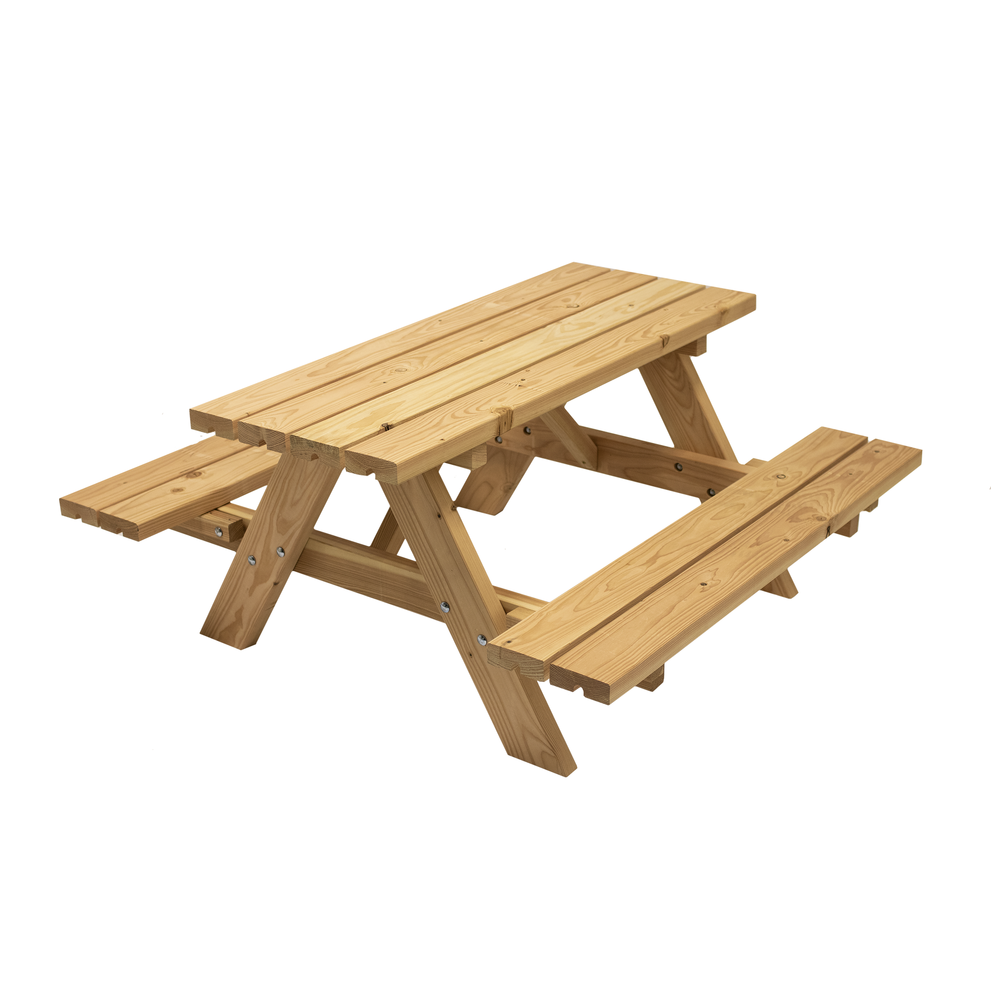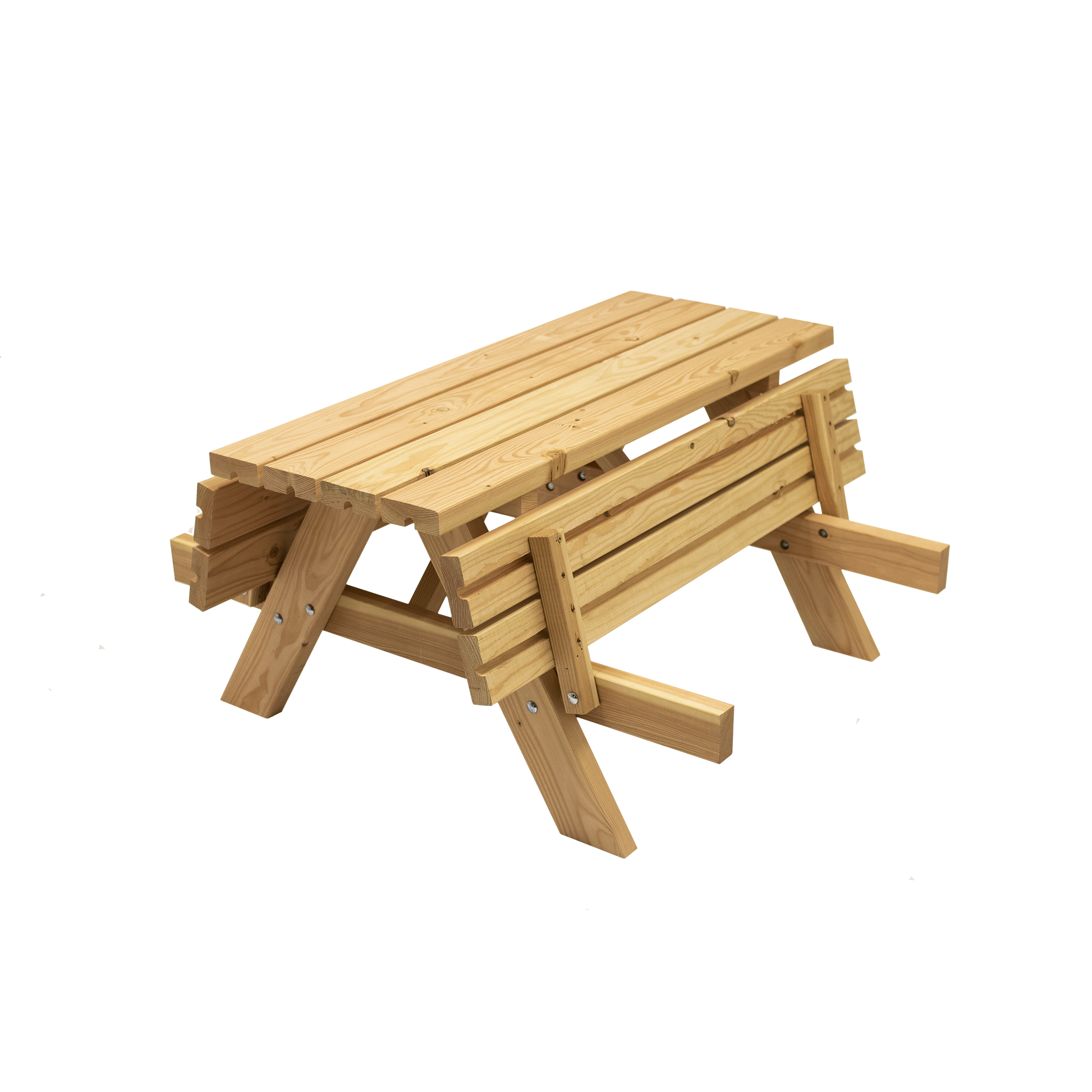 Lasten picnic -pöytäsetti, jonka materiaalina on douglaskuusi, joka on luonnostaan lahonkestävää. Istuimet ja pöytä 42 mm paksuiset. Mitat: 60 x 129 x 120 cm.
