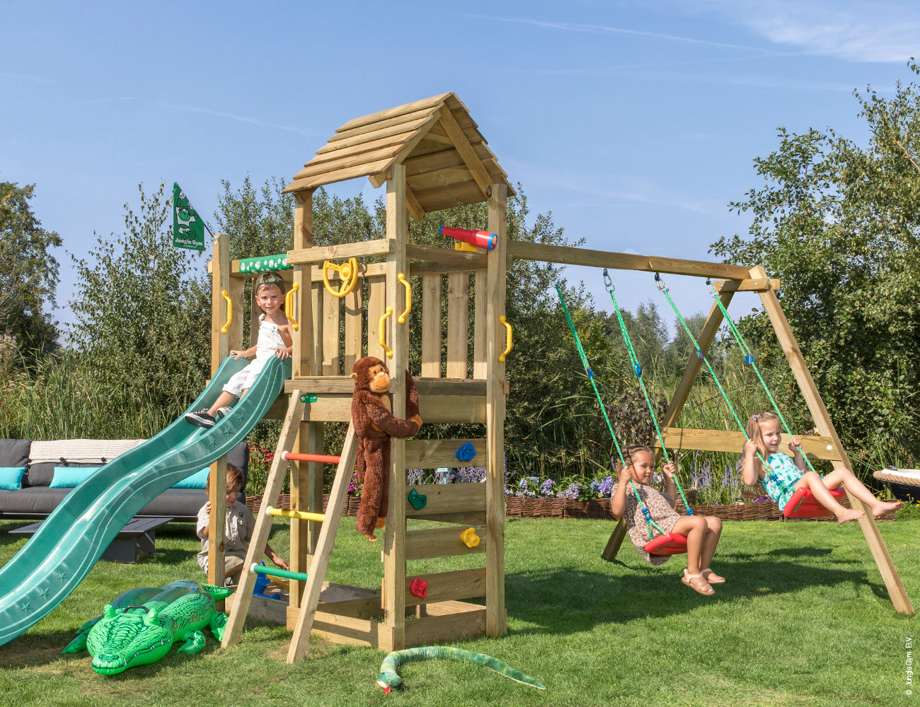Jungle Gym Safari vie leikkivän seurueen keskelle villiä luontoa. Leikkitorni tarjoaa monenlaista puuhaa ja siihen noustaan notkeasti kiipeilyseinää pitkin tai vauhdikkaasti värikkäitä tikapuita pitkin. Jungle Gym Safari -leikkitornin ylätasanteelta on hyvä tarkkailla savannin elämää. Vaaroja ja jännitystä tihkuvan ympäristön tarkkailuun on onneksi tarjolla StarOscope™ -kaukoputki. Tarpeen tullen retkikunnan päällikkö tarttuu tiukasti Jungle Steering Wheel™ -ohjauspyörään ja vie koko seurueen turvallisemmille seuduille. Leikkitornin alla, mukavasti varjossa, on hiekkalaatikko, jossa voi keskittyä valtakunnan hienoimpien hiekkakakkujen tai -linnojen suunnitteluun. Leikkitornikokonaisuuteen kuuluu keinumoduuli, jonka kahdella keinulla saadaan perhosia vatsanpohjaan villeimmillekin lapsille.