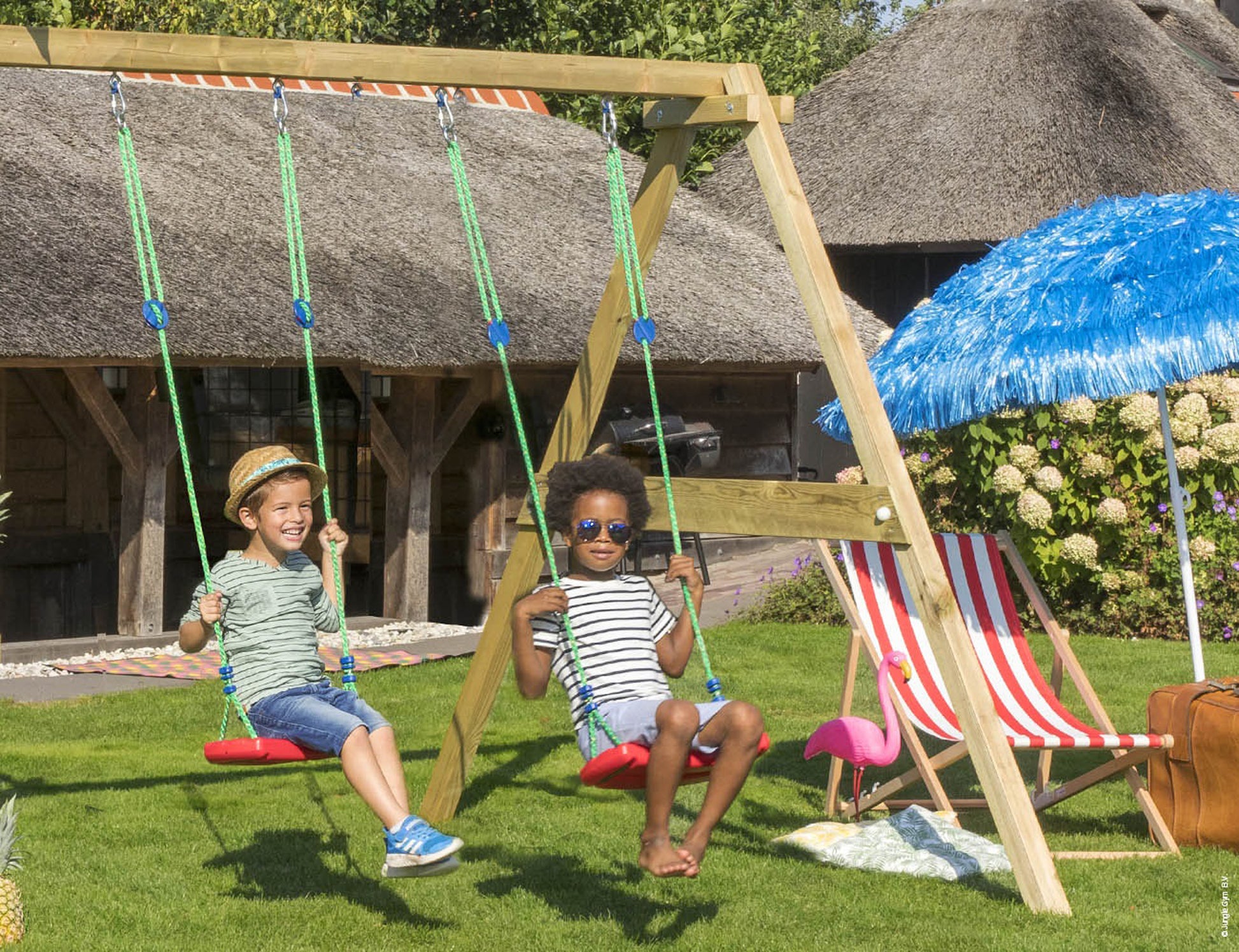Jungle Gym 2-Swing Module 220 on takuuvarma hitti leikkitornin yhteydessä. Tällä lisämoduulilla saat kaksi keinua tuomaan lisää vauhtia ja jännitystä leikkitornikokonaisuuteen. Keinut ovat perinteinen tapa kehittää lapsen motoriikkaa. Pakkaukseen kuuluu puutavaran lisäksi kaikki tarvittavat komponentit, asennusohje, maa-ankkurit, keinuistuimet (punaisia, 2 kpl.) ja keinukiinnikkeet.