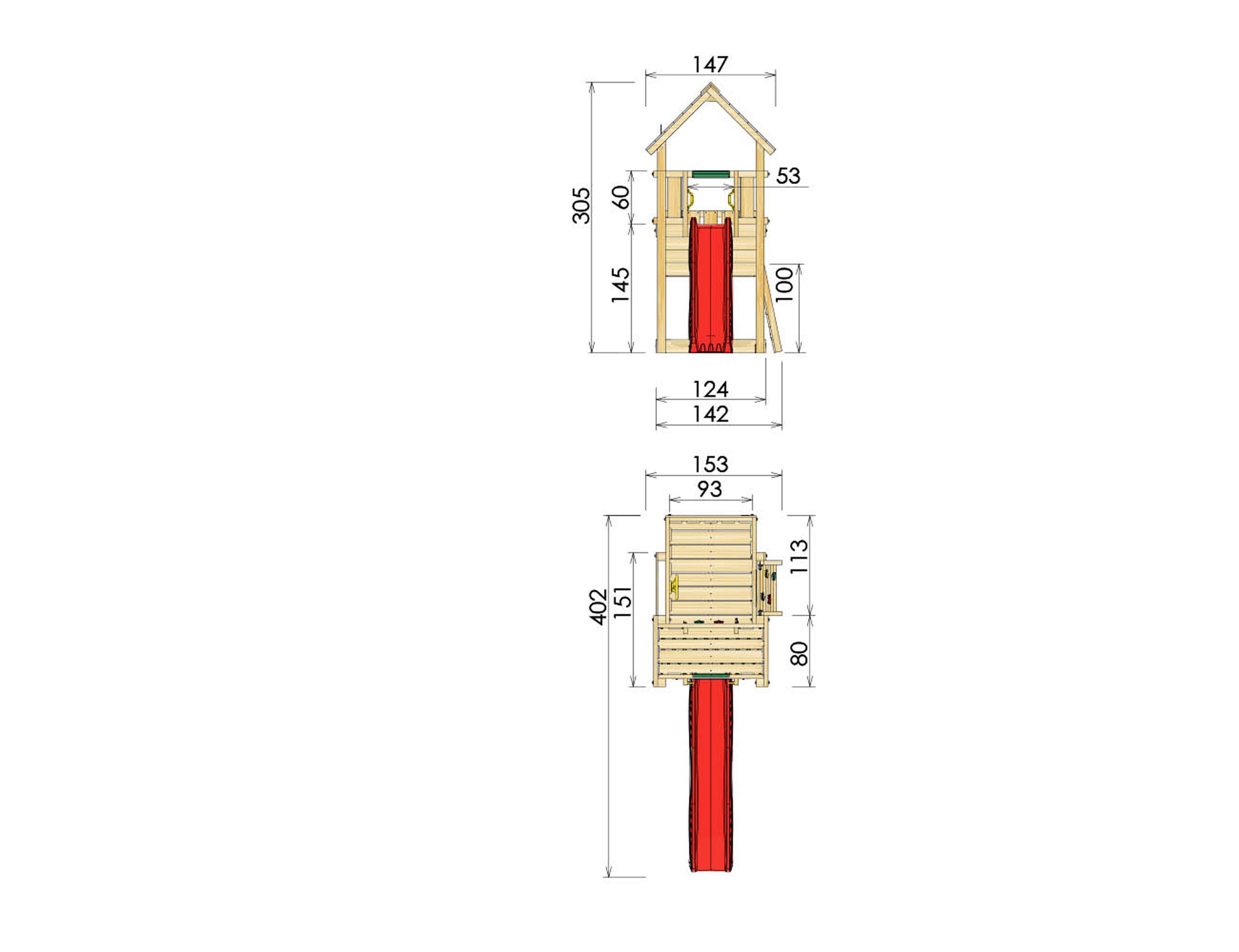 Tähän leikkitorniin kiivetään kiipeilyseinän kautta. Puinen harjakatto tarjoaa suojaa ja 160cm seisomakorkeuden. Leikkitilaa on tornissa innovatiivisesti kahdella tasolla ja parvekkeilta näkee maailman kokonaan uudella tavalla. Tilanteiden haltuun ottamista auttaa torniin kuuluva ohjauspyörä. Tornin alaosasta löytyy hiekkalaatikko, jossa voi rentoua ja leipoa vaikka kuppikakkuja tai rakentaa hiekkalinnoja. Leikkitornia voidaan laajentaa Climb- tai Swing Modul x'tra:lla tai jollakin muulla Jungle Gym- sarjan hauskalla moduulilla, jolloin puutarhassa oleva tila saadaan hyödynnettyä täysin ja luotua tilaa monelle hauskalle leikille.