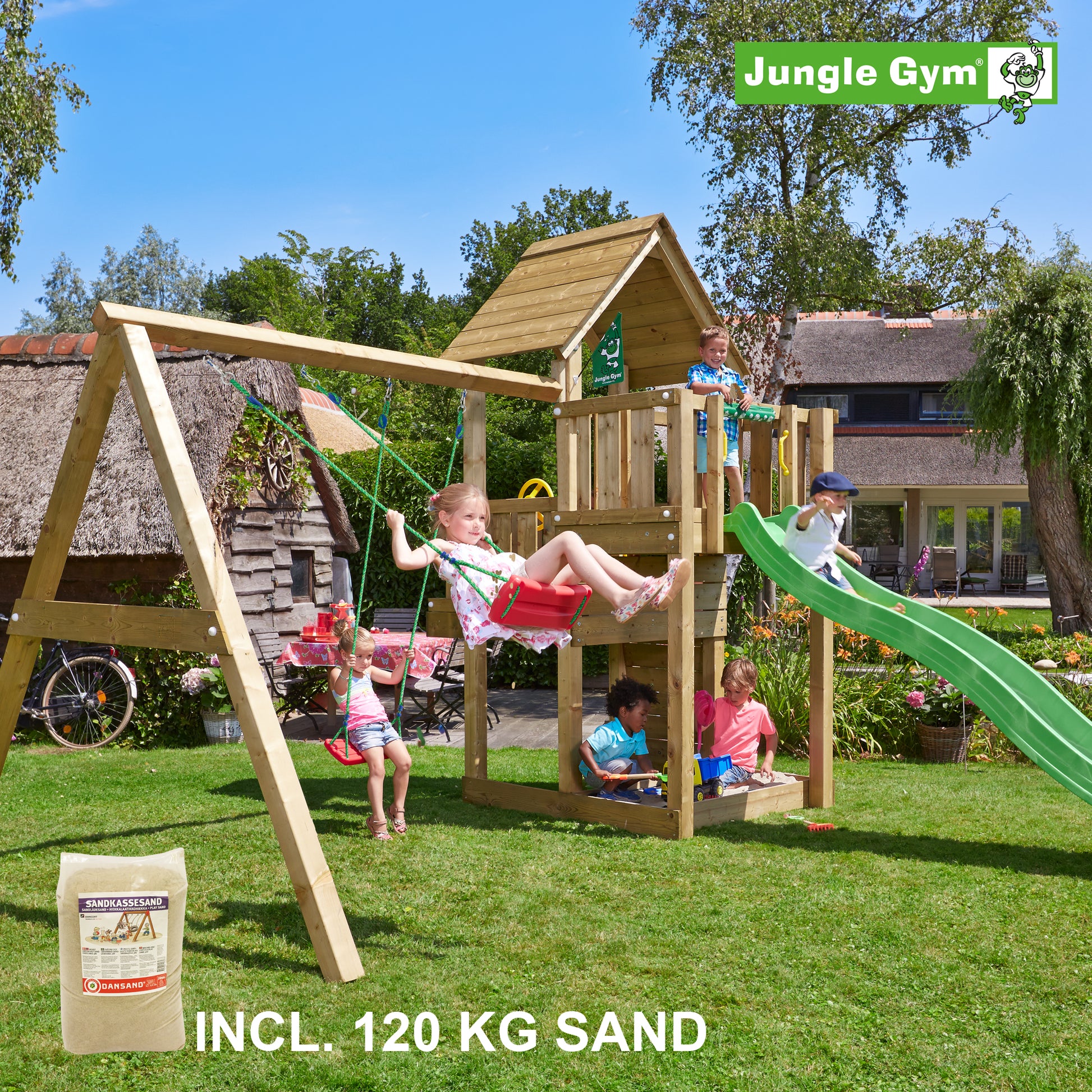 Leikkitornikokonaisuus Jungle Gym Cubby ja 2-Swing Module 220, vihreä liukumäki ja 120 kg hiekkaa