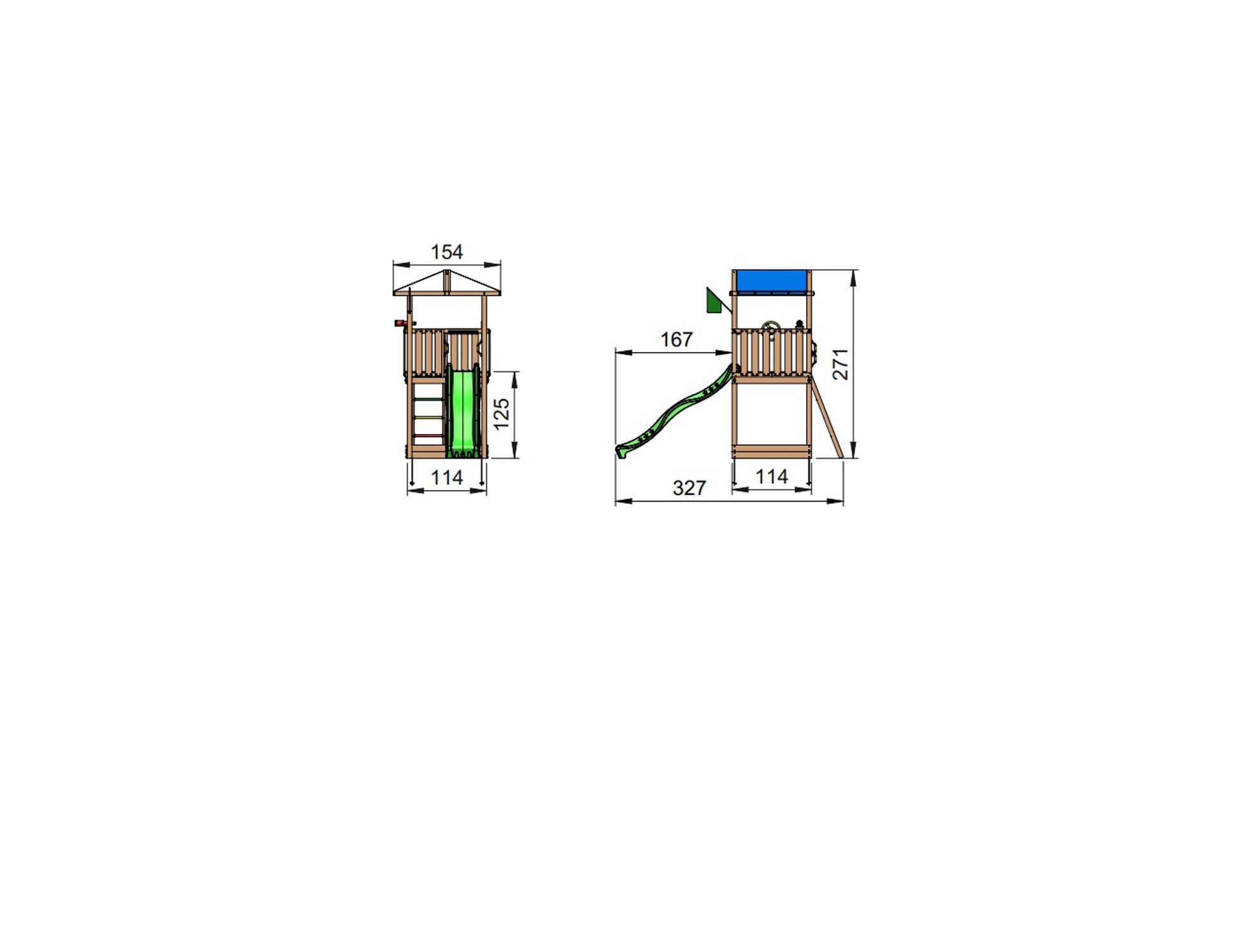 Itse koottava rakennussarja: leikkitorni toimitetaan täydellisenä rakennussarjana, jossa puuosat on valmiiksi katkaistu tarvittaviin pituuksiin.
