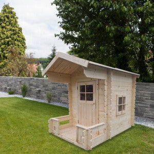 Puun luonnolliset ominaisuudet voivat näkyä pieninä halkeamina tai oksanreikinä puussa, mutta tämä ei vaikuta rakenteen kestävyyteen. Kokoonpanon jälkeen suosittelemme käsittelemään leikkimökin puunsuojalla ja päällystämään katon kattohuovalla (eivät sisälly toimitukseen).