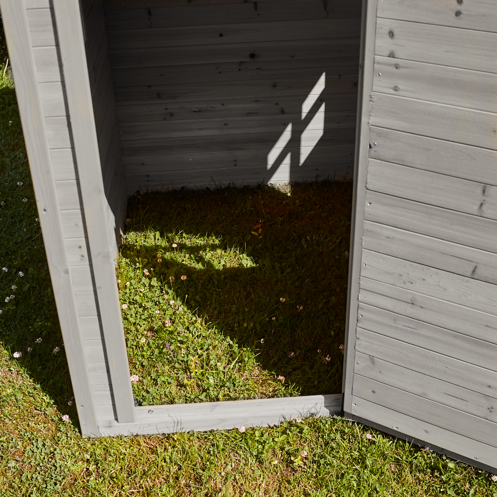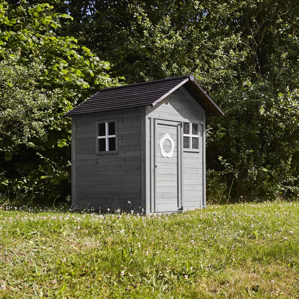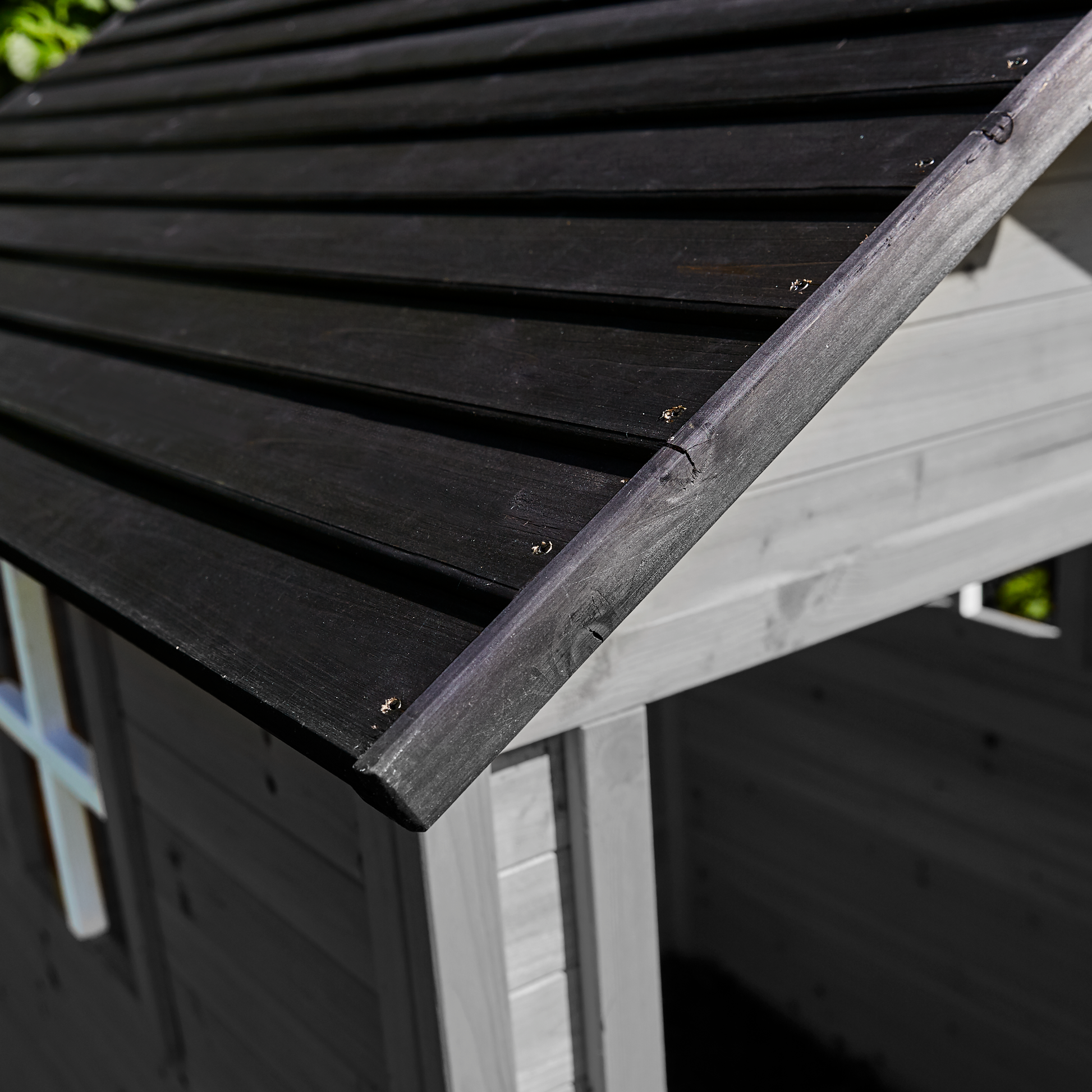 Hauska leikkimökki sisä- ja ulkokäyttöön. Tämä hieno leikkimökki antaa lapsille paikan, jossa he voivat päästää mielikuvituksen valloilleen. Siellä voivat ystävät käydä hiekkakakku ja fantasiakahvikesteillä tai mehulla. Leikkimökki on valmistettu 10 mm FSC-sertifioidusta männystä ja maalattu tyylikkään harmaan/mustansävyiseksi ja käsitelty vesiohenteisella puusuojalla, jotta sitä voidaan käyttää myös ulkona. Mökissä on tukeva puukatto ja käytännöllinen kahvallinen ovi ja 3 ikkunaa, jotka suojaavat säältä ja luovat viihtyisyyttä, jotta leikki voi jatkua sateellakin ja sieltä on helppo seurata mitä kaikkea jännittävää puutarhassa tapahtuu. Leikkimökki toimii myös sisätiloissa ja tarjoaa lapselle mukavan majan, jossa voi leikkiä ympäri vuoden. Leikkimökki on toimituksen yhteydessä osittain koottu osiin, minkä vuoksi se on helppo ja nopea koota ja leikkiminen voi alkaa mahdollisimman pian.