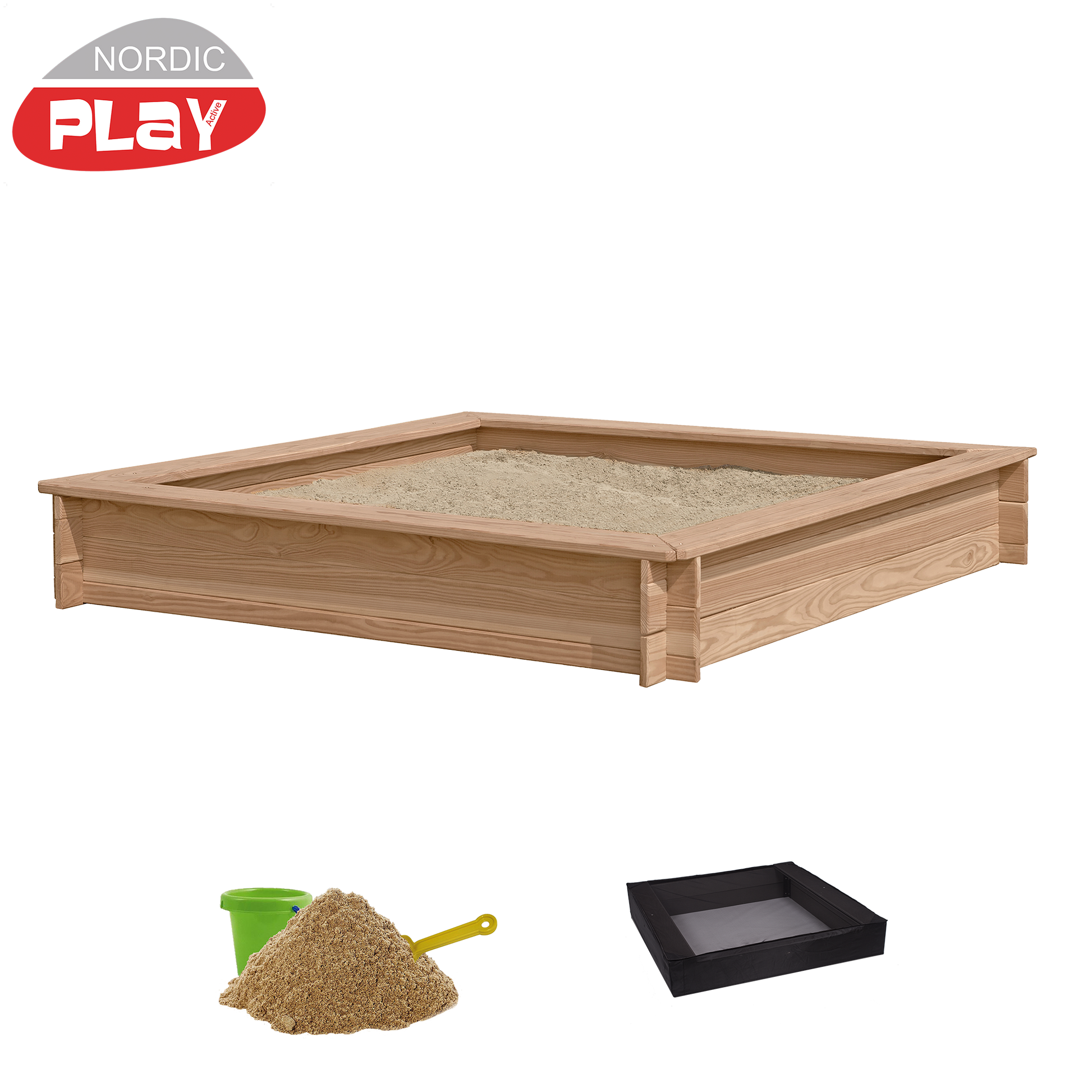 NORDIC PLAY Hiekkalaatikko, lehtikuusi, 150 x 150 cm sis. verkko ja 200 kg hiekkaa