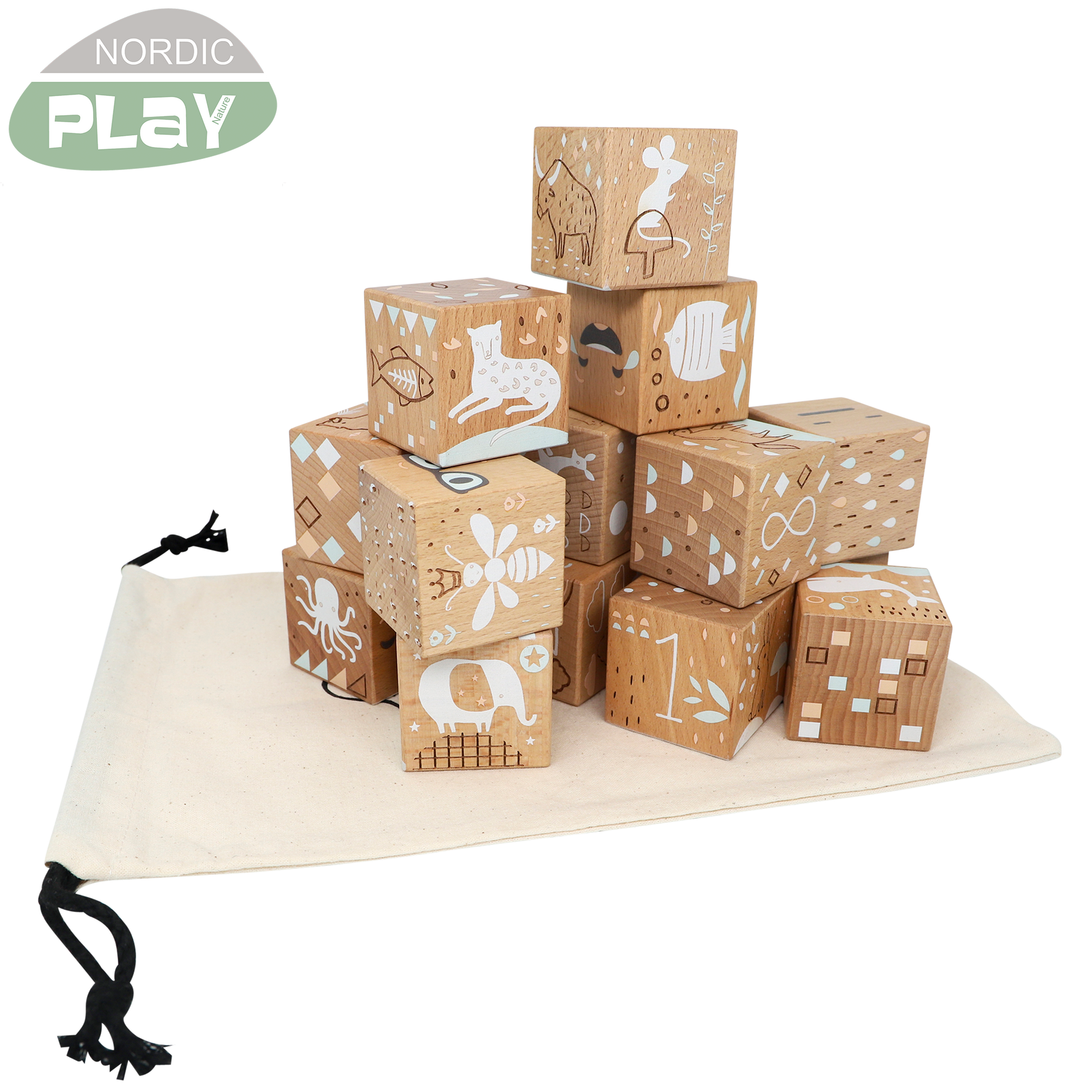 NORDIC PLAY Nature - Kauniit pyökkipalikat numero-, kasvo- ja eläinkuvioilla. Painettu ympäristöystävällisellä, myrkyttömällä maalilla. Palikat on valmistettu 100% FSC®-sertifioidusta kestävän kehityksen puusta. Hauskat palikat inspiroivat oppimista, leikkiä ja moottoriikan kehitystä. Pyökki muuttuu pehmeäksi, eikä puunsirpaleita ilmesty, vaikka vauva laittaisi palikan suuhun.