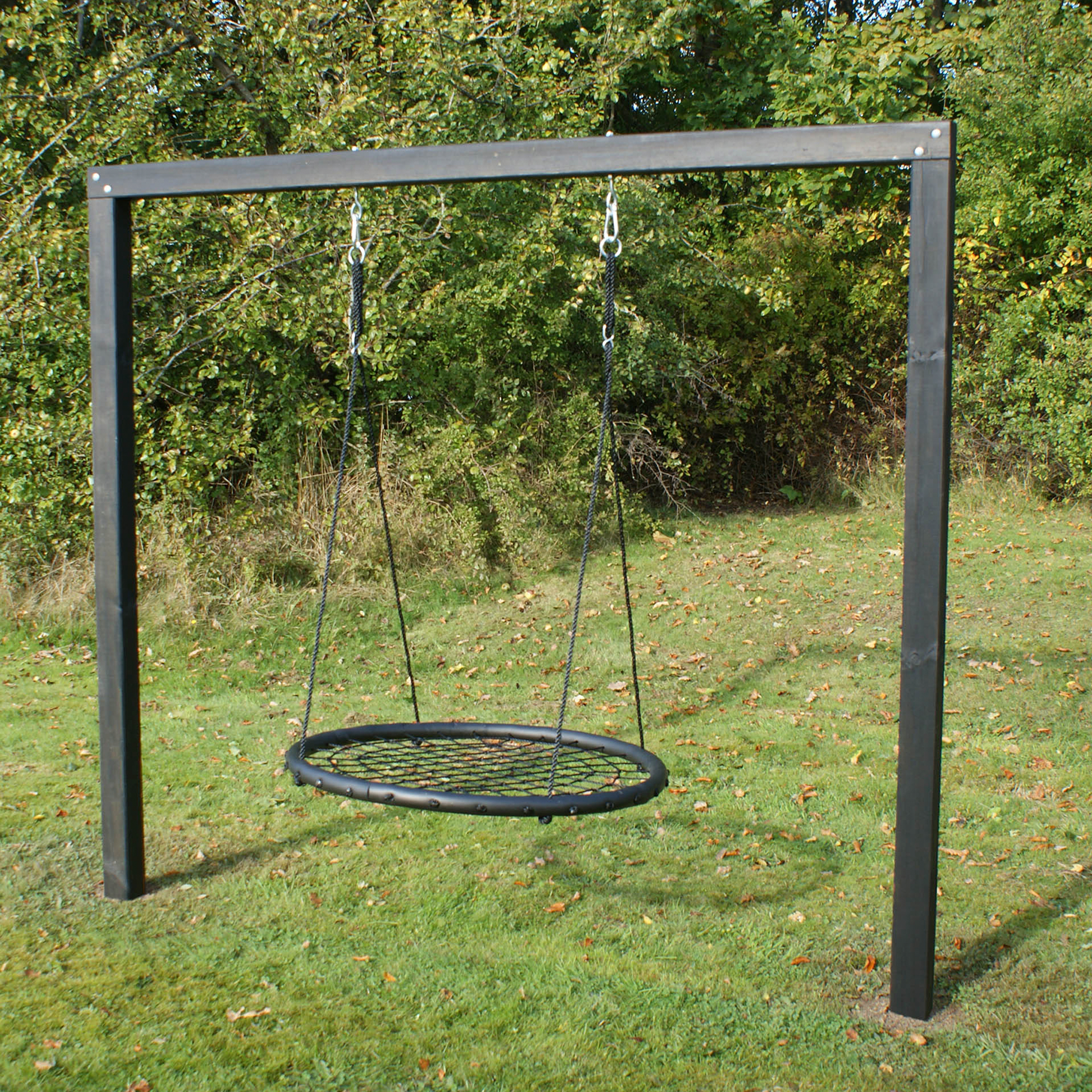 Asta maahan kaivettava keinuteline. Mukana NORDIC PLAY linnunpesäkeinu. Musta petsattu, FSC-sertifioitu puu.