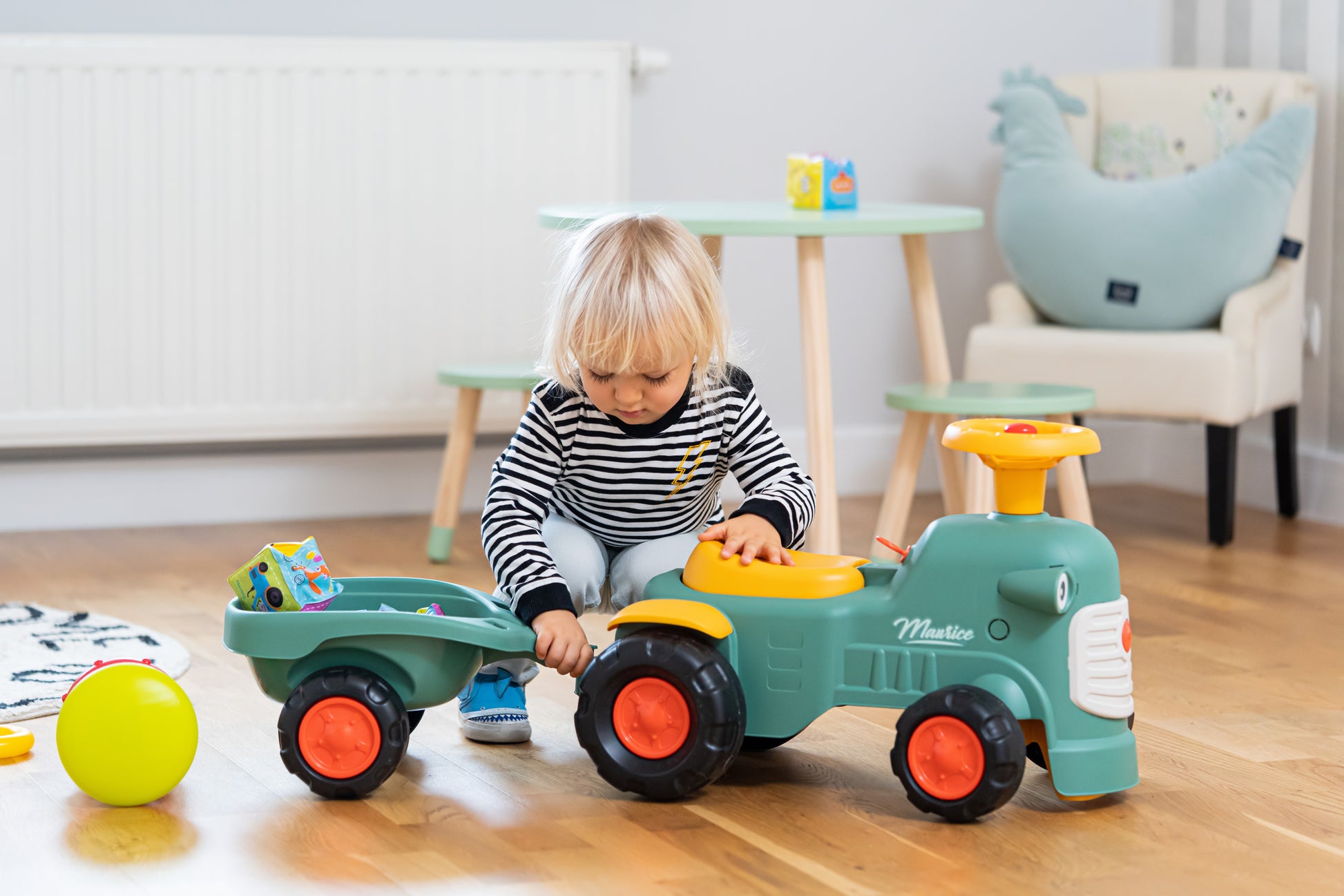 Maurice on ihastuttava lapsen ensimmäinen oma traktori! Potkutraktorissa on äänimerkillä varustettu ohjauspyörä ja tässä mallissa on mukana myös vihreä peräkärry!