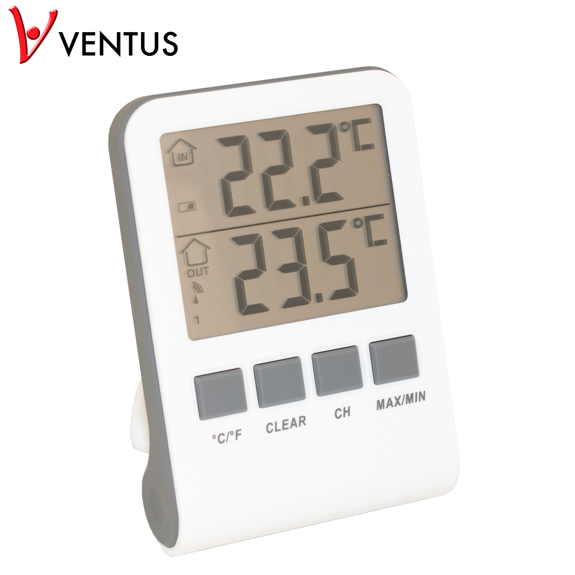 VENTUS WA118 digitaalinen lämpömittari näyttää sisä- ja ulkolämpötilan min/max -muistilla. Langaton ulkoanturi kuuluu pakkaukseen.